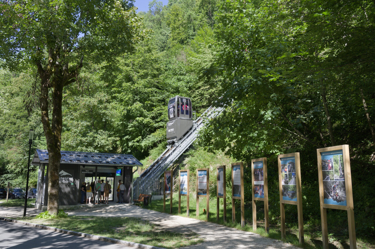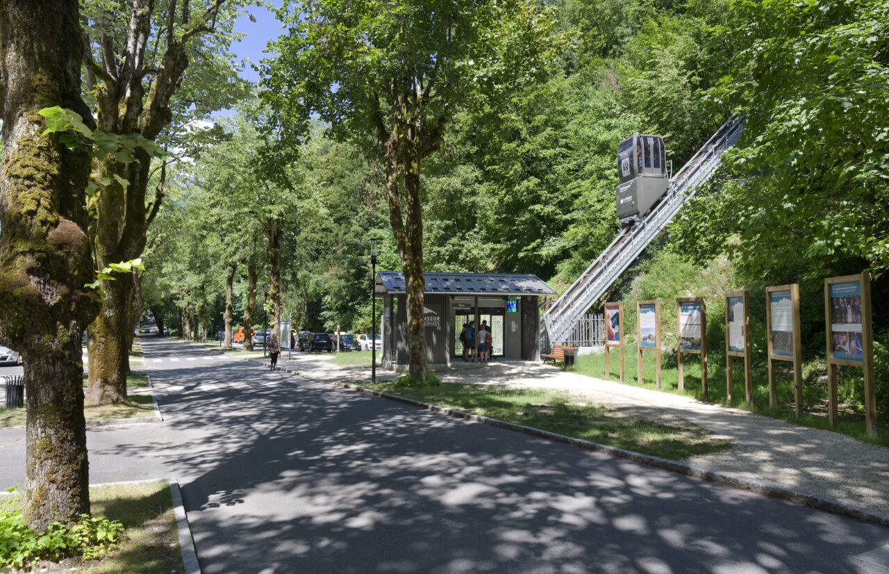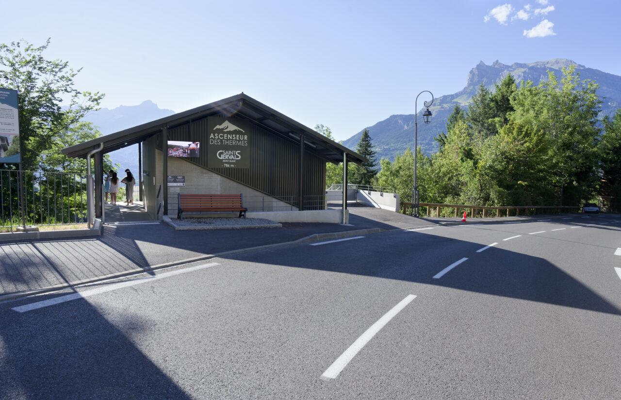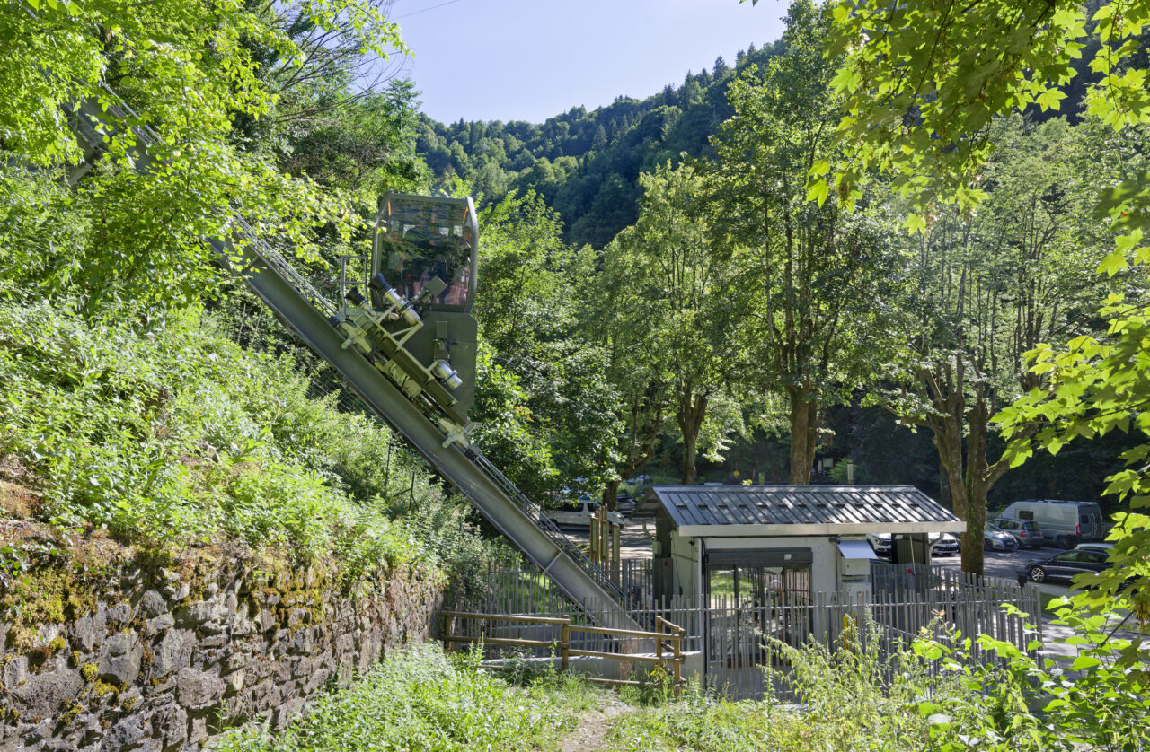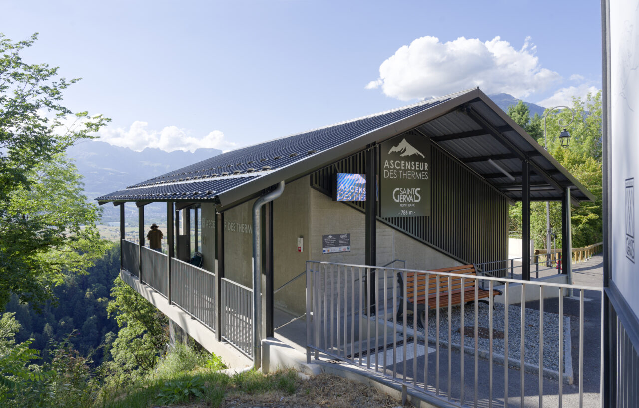 Les habitants de Saint-Gervais-les-Bains étaient déjà habitués au régime d’innovation qui caractérise les équipements publics de leur commune : un espace d’exposition d’art contemporain dans une pile de pont ou encore le réseau de mobilités qui se déploie sur le territoire – de l’ascenseur valléen aux navettes électriques gratuites. Mais de là à s’imaginer un jour remonter la pente à l’aide des eaux usées, il y avait un gouffre. Le projet suit pourtant la ligne directrice de la mairie, c’est-à-dire redonner la liberté grâce aux transports en commun et non pas grâce à la voiture, comme l’avaient vanté les années 1980. La topographie et l’éclatement des hameaux de Saint-Gervais-les-Bains, dont les deux principaux sont le Fayet dans la vallée de l’Arve et le centre-bourg, ont motivé cette ingéniosité multimodale. C’est ainsi que depuis l’été 2024, un ascenseur incliné relie le parc des thermes au Fayet au bourg, accroché à flanc de montagne. Au-delà des objectifs de connexion évidents, qui concourent à ce que Saint-Gervais se réapproprie son thermalisme, on ne peut que saluer le geste fort de cet objet d’ingénierie de pointe qui se saisit d’un principe ancestral : celui du lest, du contrepoids et de la poulie. Le lest n’est pourtant pas des plus communs, car il s’agit d’eaux usées déviées du réseau qui viennent remplir le ballast sous la cabine !
