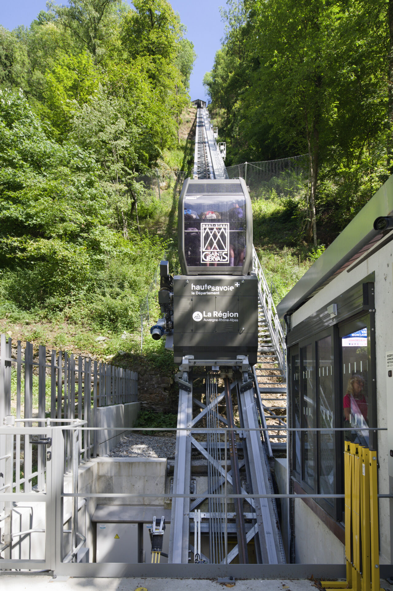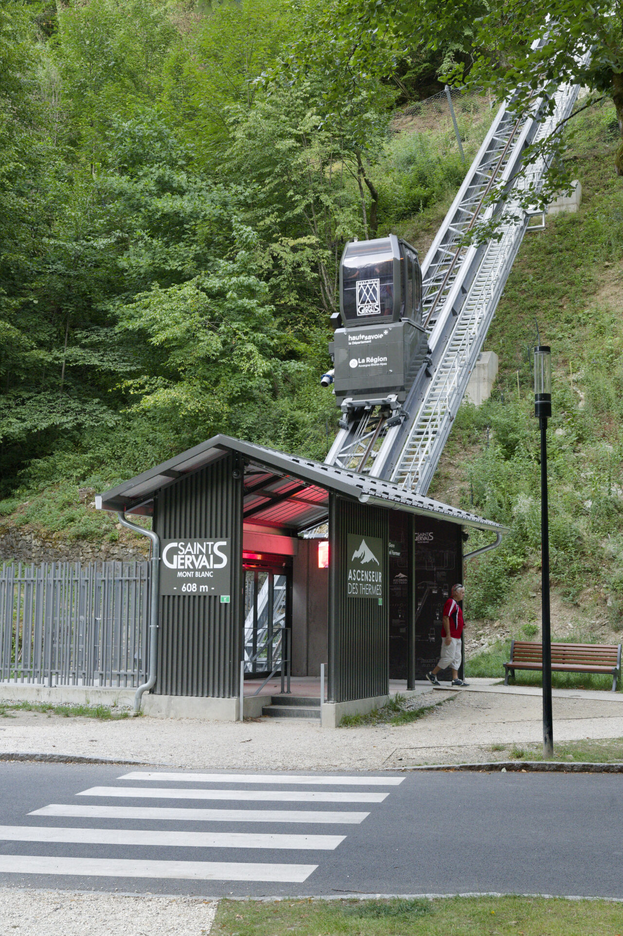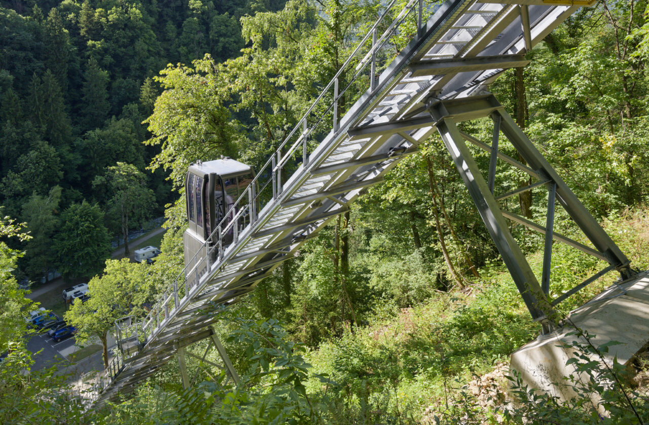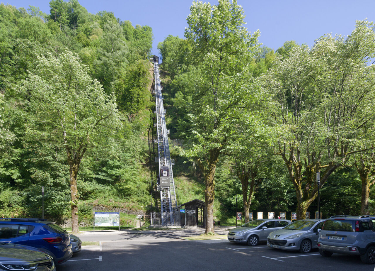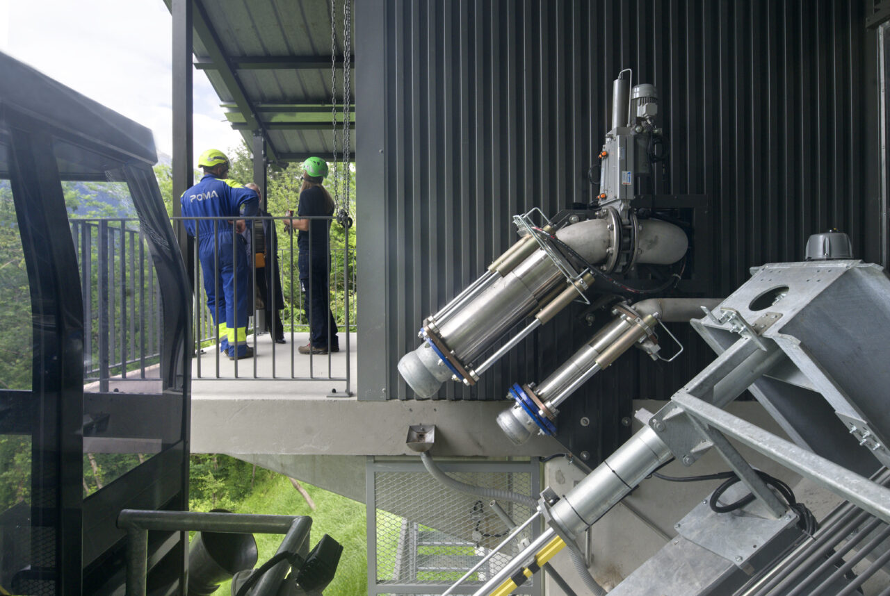 Les habitants de Saint-Gervais-les-Bains étaient déjà habitués au régime d’innovation qui caractérise les équipements publics de leur commune : un espace d’exposition d’art contemporain dans une pile de pont ou encore le réseau de mobilités qui se déploie sur le territoire – de l’ascenseur valléen aux navettes électriques gratuites. Mais de là à s’imaginer un jour remonter la pente à l’aide des eaux usées, il y avait un gouffre. Le projet suit pourtant la ligne directrice de la mairie, c’est-à-dire redonner la liberté grâce aux transports en commun et non pas grâce à la voiture, comme l’avaient vanté les années 1980. La topographie et l’éclatement des hameaux de Saint-Gervais-les-Bains, dont les deux principaux sont le Fayet dans la vallée de l’Arve et le centre-bourg, ont motivé cette ingéniosité multimodale. C’est ainsi que depuis l’été 2024, un ascenseur incliné relie le parc des thermes au Fayet au bourg, accroché à flanc de montagne. Au-delà des objectifs de connexion évidents, qui concourent à ce que Saint-Gervais se réapproprie son thermalisme, on ne peut que saluer le geste fort de cet objet d’ingénierie de pointe qui se saisit d’un principe ancestral : celui du lest, du contrepoids et de la poulie. Le lest n’est pourtant pas des plus communs, car il s’agit d’eaux usées déviées du réseau qui viennent remplir le ballast sous la cabine !
