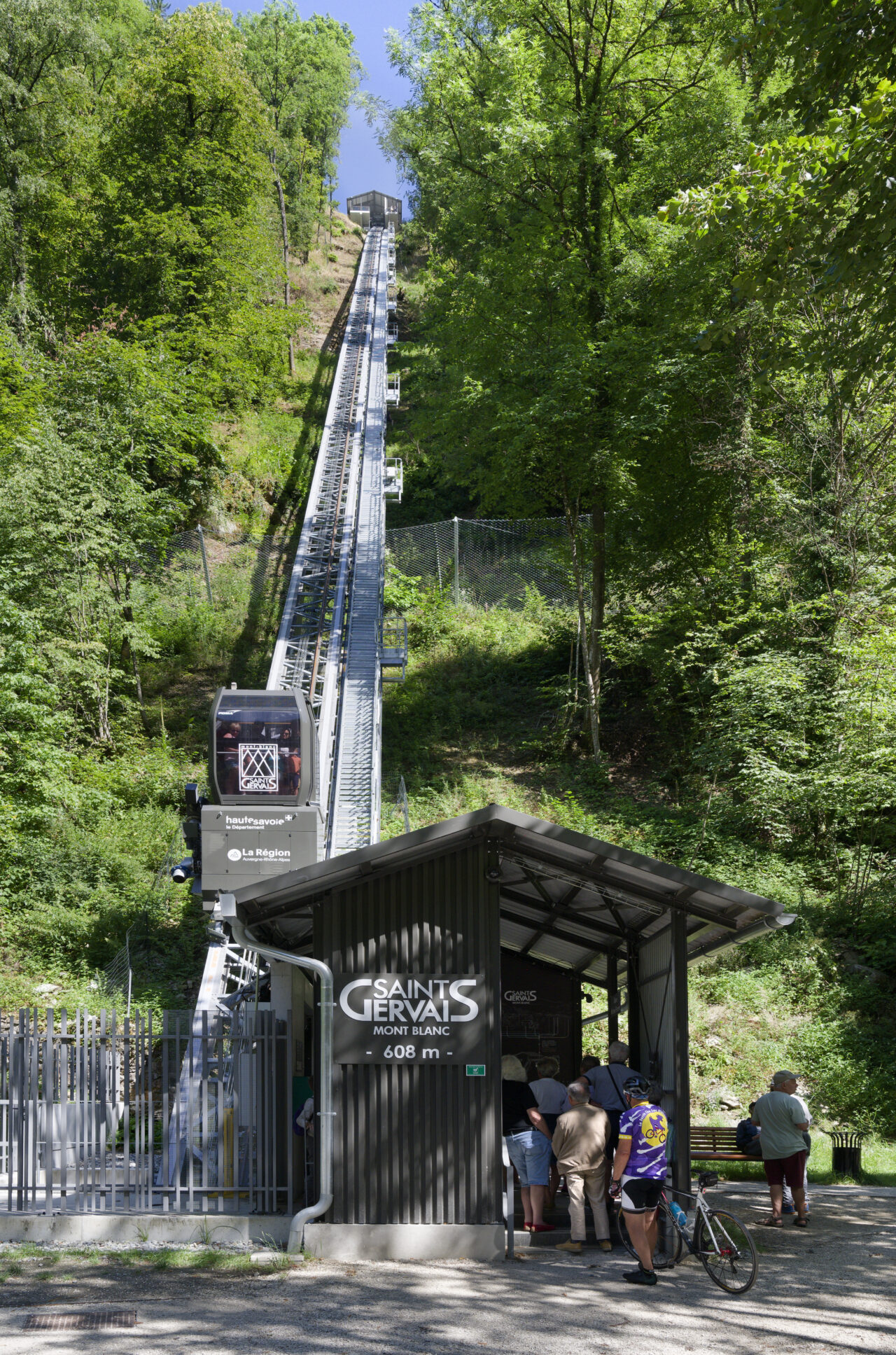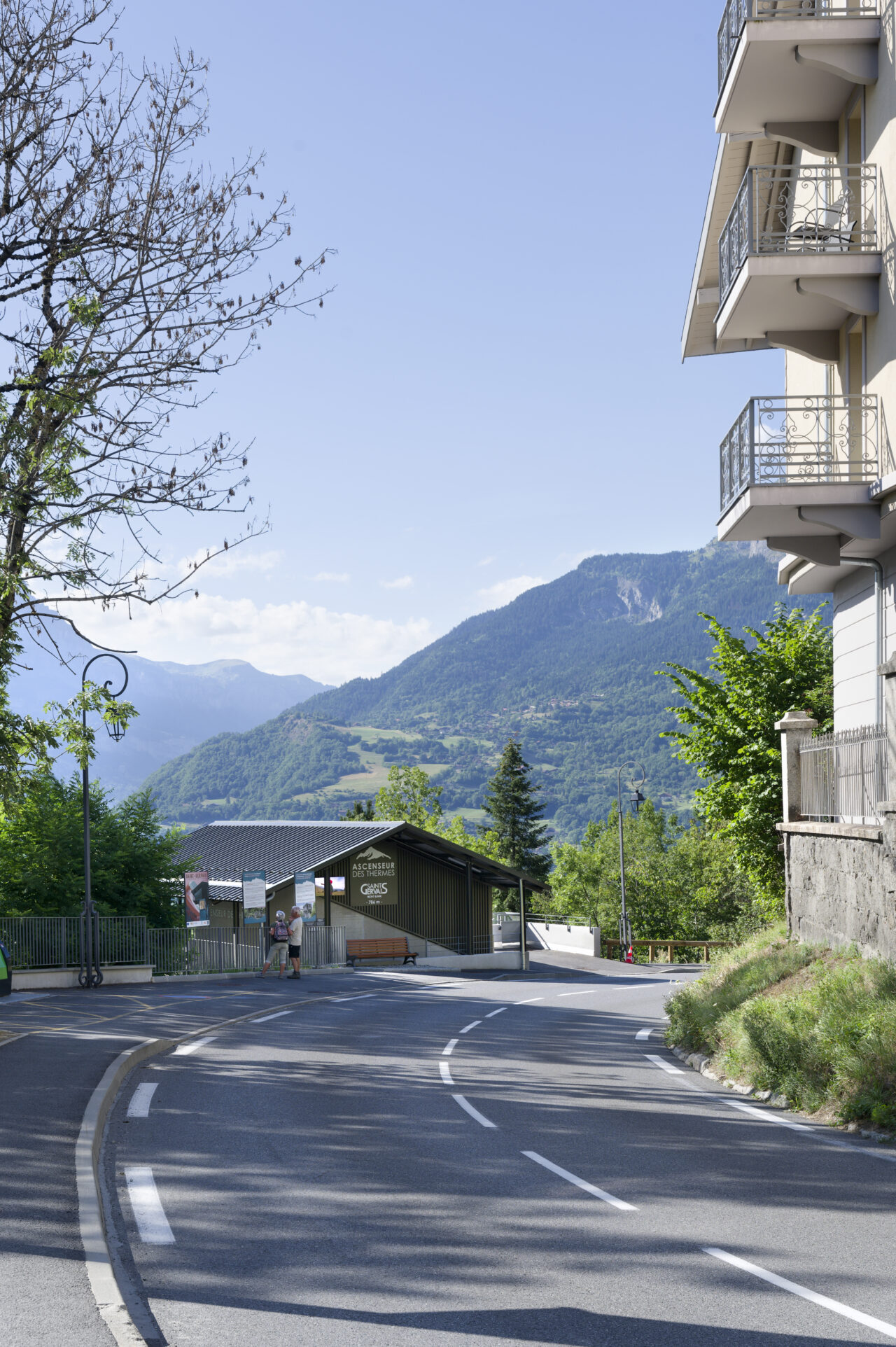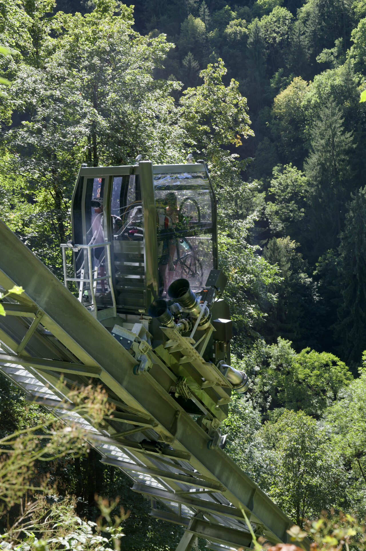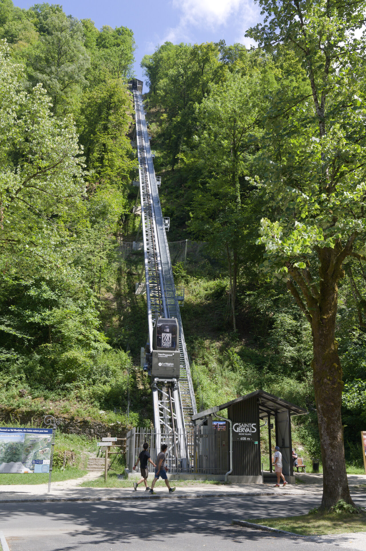 Les habitants de Saint-Gervais-les-Bains étaient déjà habitués au régime d’innovation qui caractérise les équipements publics de leur commune : un espace d’exposition d’art contemporain dans une pile de pont ou encore le réseau de mobilités qui se déploie sur le territoire – de l’ascenseur valléen aux navettes électriques gratuites. Mais de là à s’imaginer un jour remonter la pente à l’aide des eaux usées, il y avait un gouffre. Le projet suit pourtant la ligne directrice de la mairie, c’est-à-dire redonner la liberté grâce aux transports en commun et non pas grâce à la voiture, comme l’avaient vanté les années 1980. La topographie et l’éclatement des hameaux de Saint-Gervais-les-Bains, dont les deux principaux sont le Fayet dans la vallée de l’Arve et le centre-bourg, ont motivé cette ingéniosité multimodale. C’est ainsi que depuis l’été 2024, un ascenseur incliné relie le parc des thermes au Fayet au bourg, accroché à flanc de montagne. Au-delà des objectifs de connexion évidents, qui concourent à ce que Saint-Gervais se réapproprie son thermalisme, on ne peut que saluer le geste fort de cet objet d’ingénierie de pointe qui se saisit d’un principe ancestral : celui du lest, du contrepoids et de la poulie. Le lest n’est pourtant pas des plus communs, car il s’agit d’eaux usées déviées du réseau qui viennent remplir le ballast sous la cabine !
