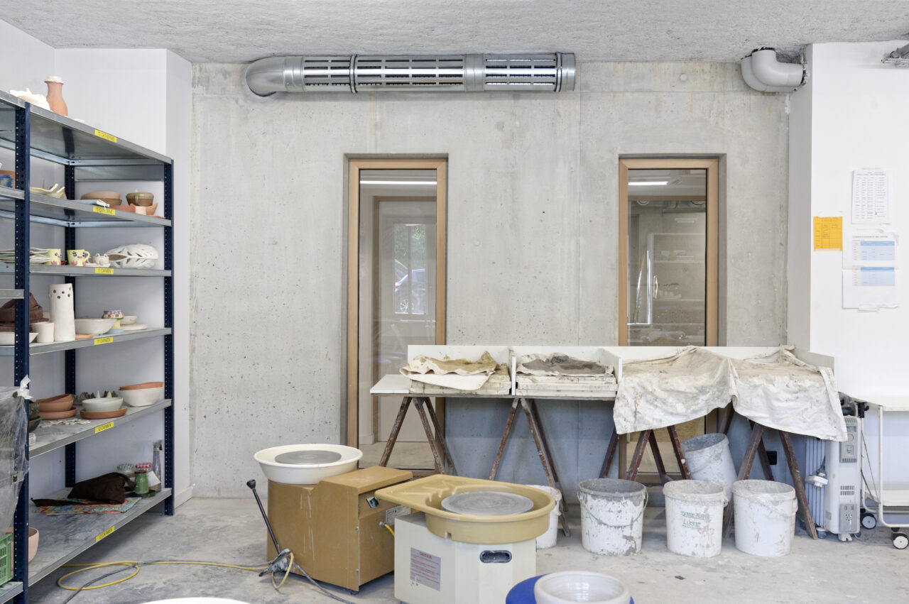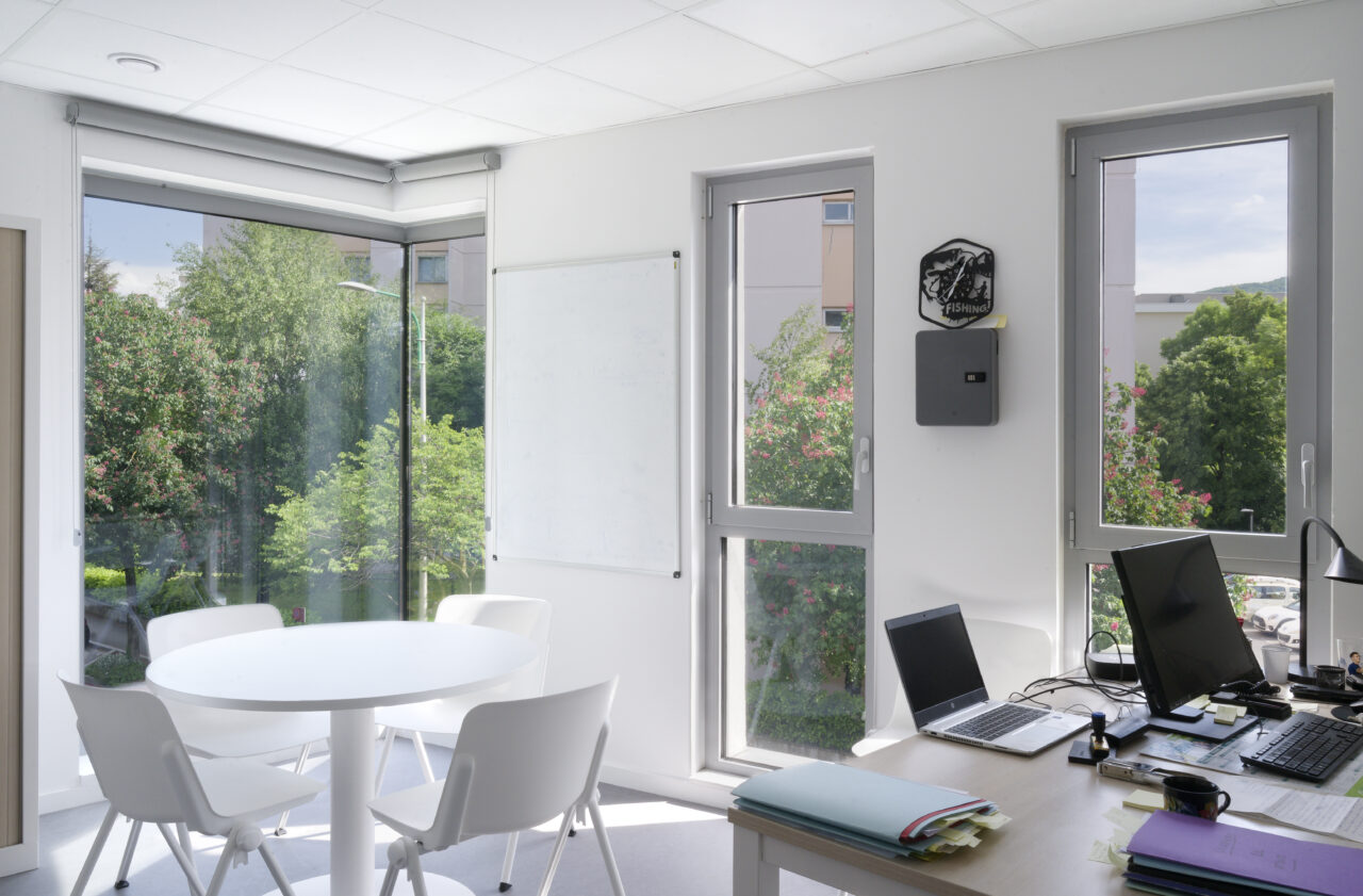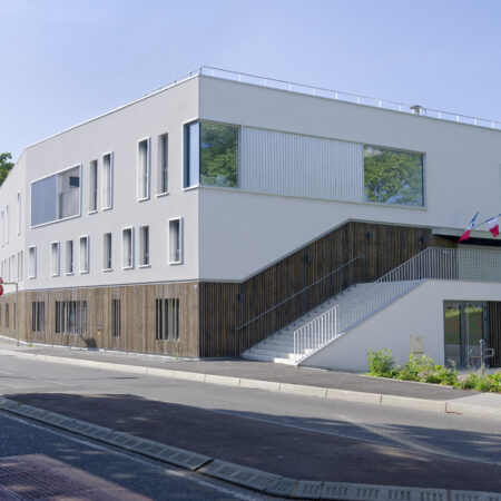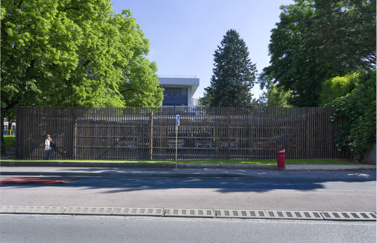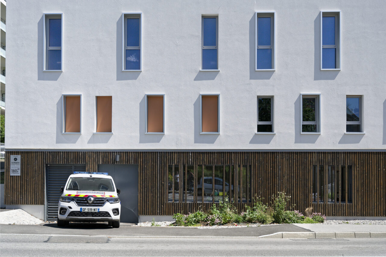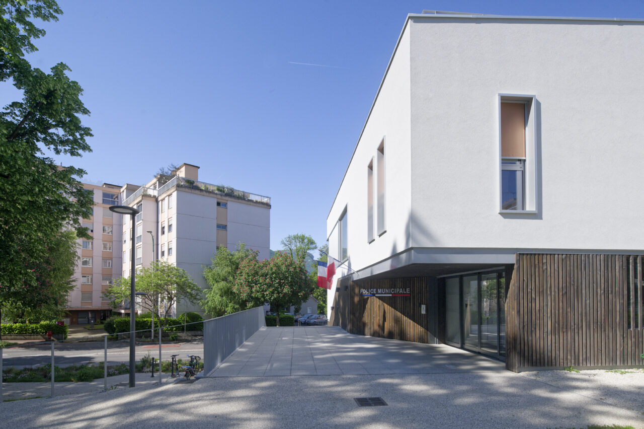 Le programme pouvait sembler saugrenu : sur un site de taille relativement modeste, un bâtiment permettant de regrouper les services auparavant éclatés de la police municipale, articulé avec vingt places de stationnement pour leurs véhicules et… le relogement de l’atelier de poterie florissant. La commune d’Annemasse, maître d’ouvrage, jette son dévolu sur une procédure de marché public global de performance (MPGP) pour un projet au budget et aux délais encadrés. Le mandataire Campenon Bernard Dauphiné Savoie, filiale de Vinci, s’est associé avec l’architecte Vincent Rocques qui met son point d’honneur à suivre le chantier – bien que la procédure ne le requière pas. Le chantier d’un an au coût tenu, est selon lui le fruit d’une alchimie qui s’est faite au sein de l’équipe de maîtrise d’œuvre et avec la maîtrise d’ouvrage. L’architecte le dit en toute franchise : le parti-pris initial, grâce aux discussions avec la maîtrise d’ouvrage, a été totalement transformé vers plus de compacité. Le choix de changer la destinée d’un parking public attenant en un enclos protégé pour les stationnements a fait des heureux. Libéré de cette contrainte, c’est un seul bâtiment qui accueille désormais les agents de la police municipale dans les deux étages supérieurs, et les pratiquants des ateliers de poterie ont investi le soubassement.
