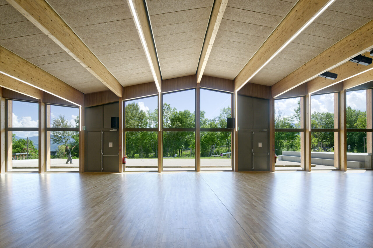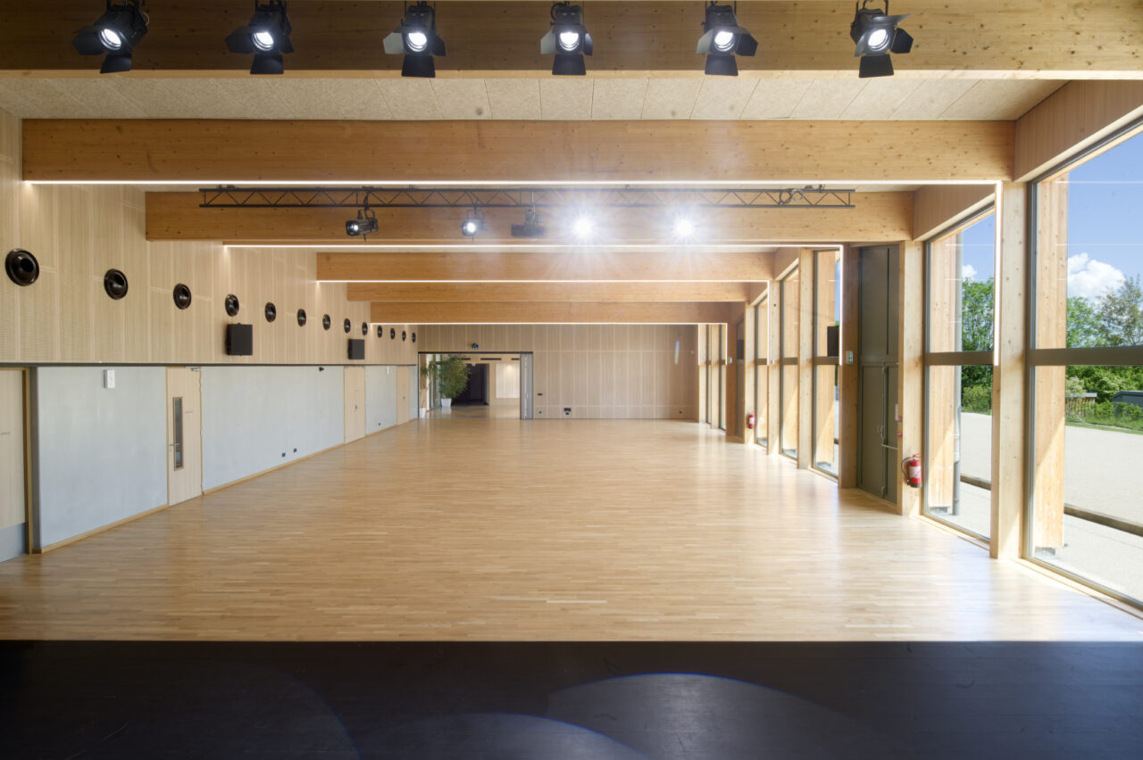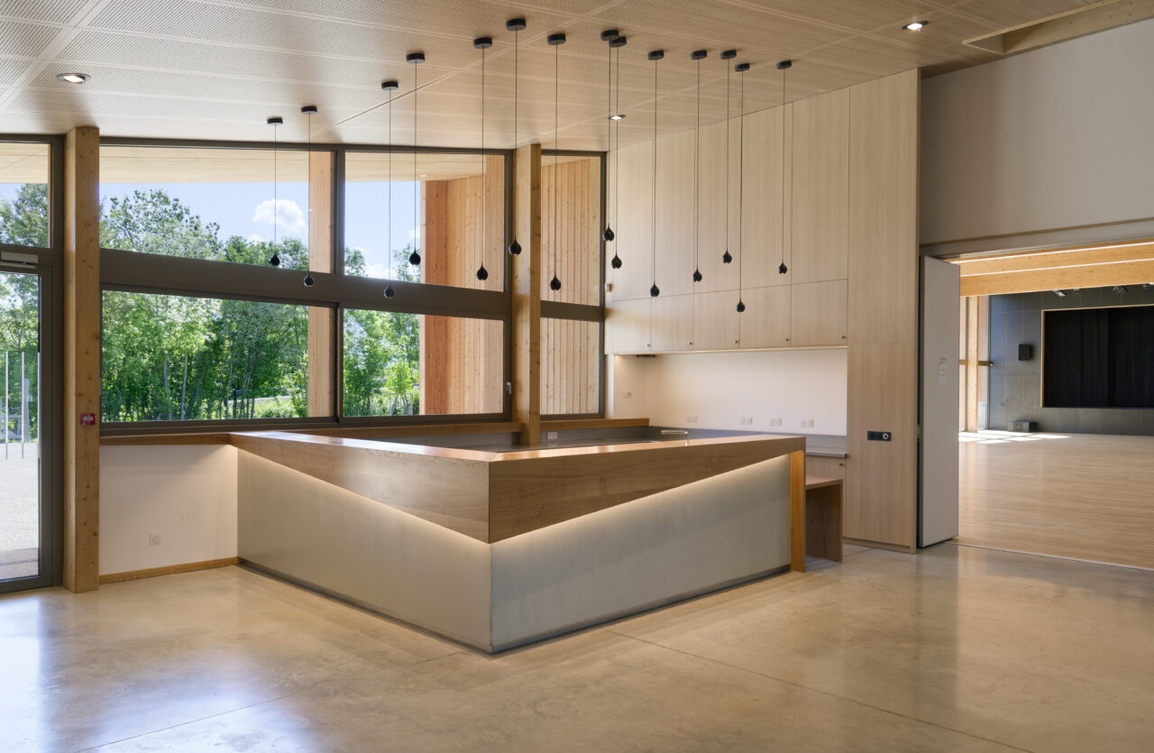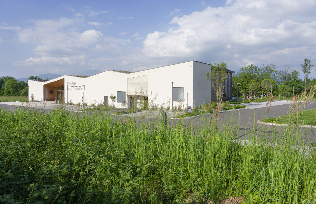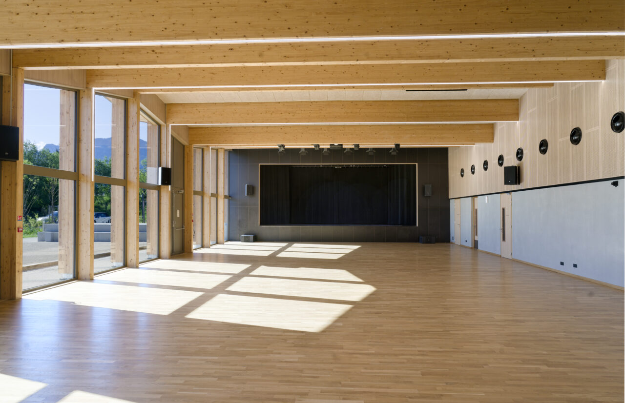 Les employés de la mairie se plaisent à le dire : Eteaux est au centre de la Haute-Savoie. En cette qualité, c’est un lieu stratégique pour se réunir à l’échelle départementale. Cette commune rurale de 2 200 habitants, contiguë à La Roche-sur-Foron, a par ailleurs une vie associative très fournie. De là a naturellement découlé, avec l’accompagnement du CAUE, la programmation foisonnante de cet « espace multifonction », véritable signal pour les personnes qui empruntent l’autoroute, en particulier à la tombée de la nuit lorsqu’il est éclairé. L’équipe municipale a mis un point d’honneur à ce que l’espace, polymorphe, puisse être le théâtre aussi bien de tennis de table, de danse, de réunions que de festivités. Tout projet se doit d’être relié à son territoire et accessible, d’autant plus lorsqu’il a vocation à être très sollicité. C’est pourquoi les modes doux sont encouragés par un cheminement pour les piétons et les vélos qui relie l’espace multifonction au centre d’Eteaux. Motivée par l’objectif d’inauguration lors des vœux en 2025, l’équipe orchestrée par AER Architectes a mené à bien ce chantier impressionnant d’un bâtiment de bois et de béton tourné vers les montagnes du Môle et de Sous-dine, qui ont donné leurs noms aux deux salles.
