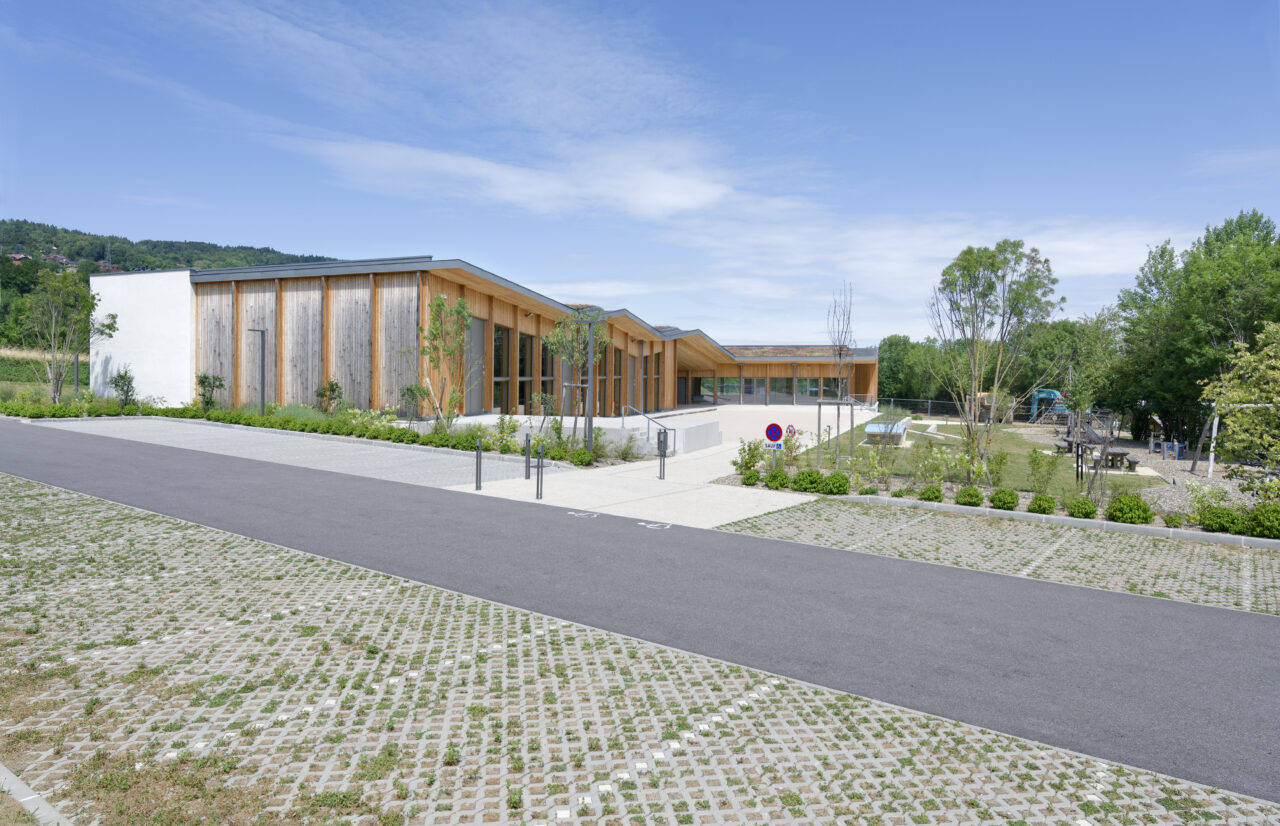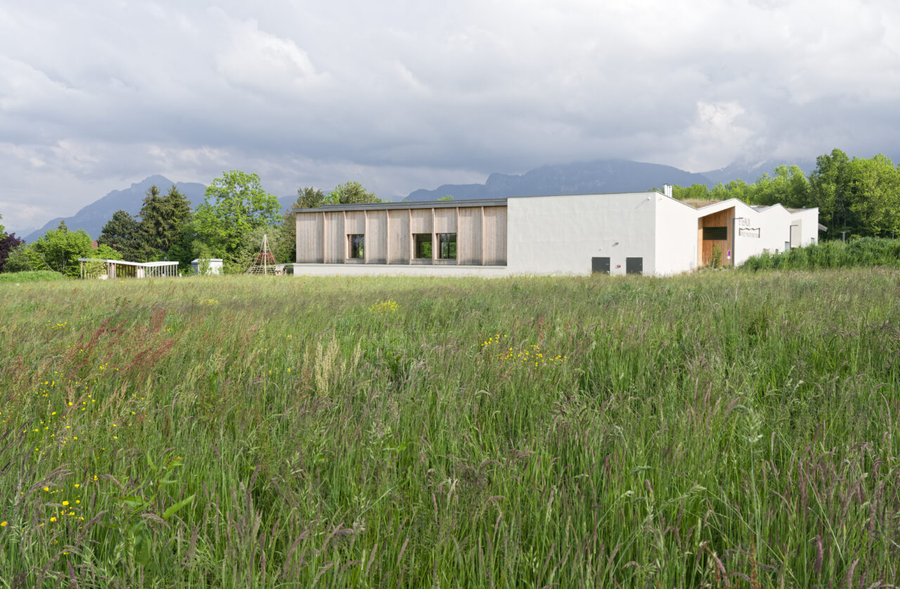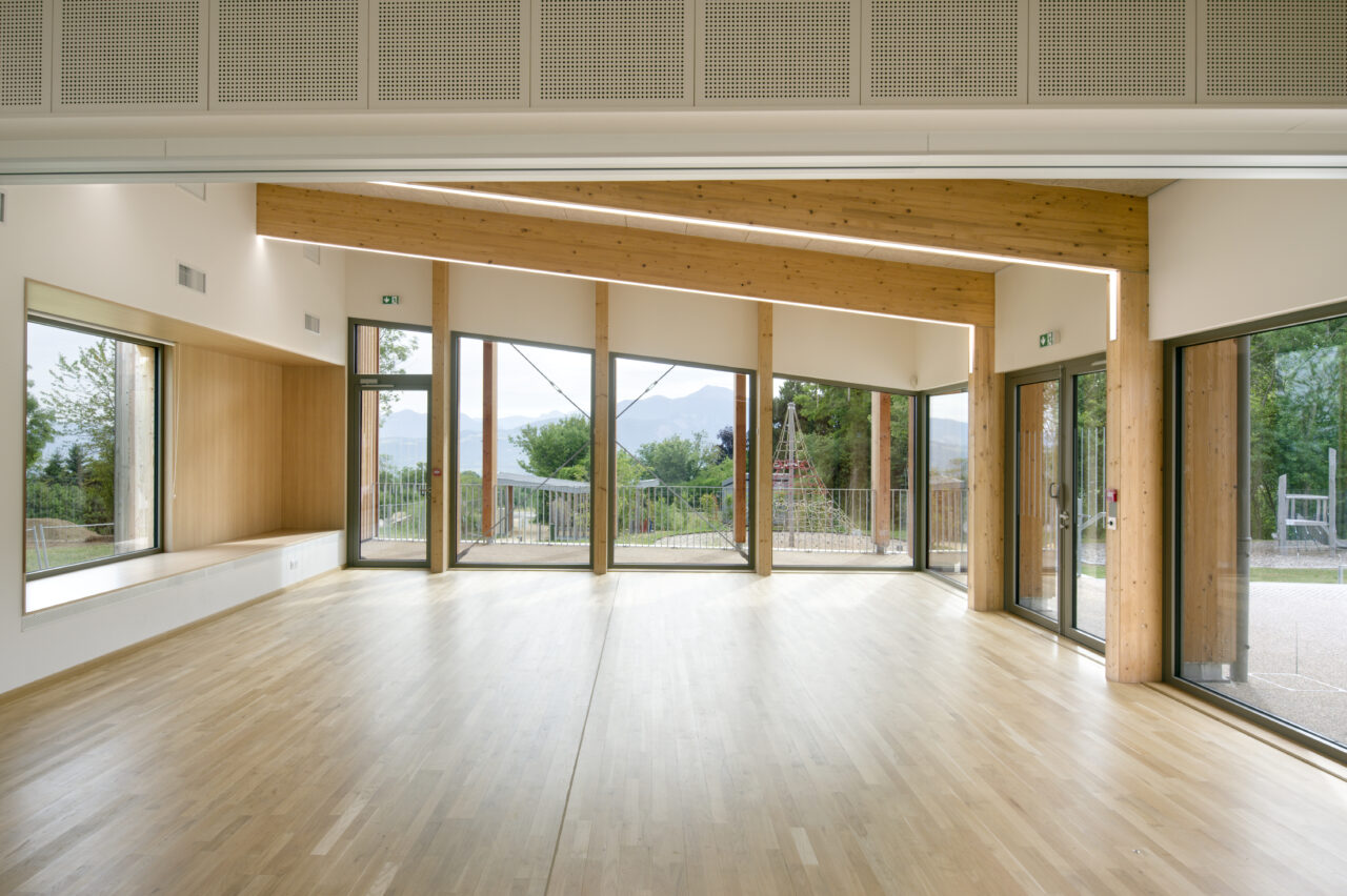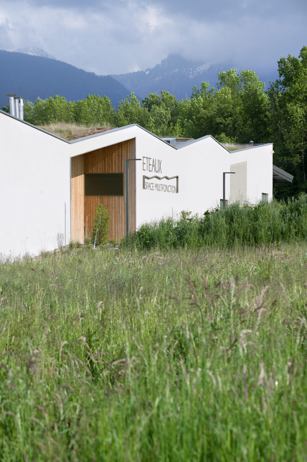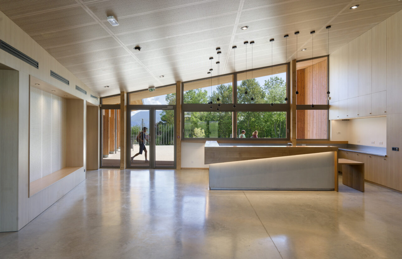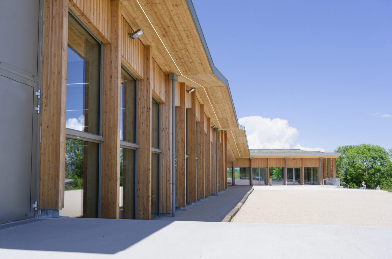 Les employés de la mairie se plaisent à le dire : Eteaux est au centre de la Haute-Savoie. En cette qualité, c’est un lieu stratégique pour se réunir à l’échelle départementale. Cette commune rurale de 2 200 habitants, contiguë à La Roche-sur-Foron, a par ailleurs une vie associative très fournie. De là a naturellement découlé, avec l’accompagnement du CAUE, la programmation foisonnante de cet « espace multifonction », véritable signal pour les personnes qui empruntent l’autoroute, en particulier à la tombée de la nuit lorsqu’il est éclairé. L’équipe municipale a mis un point d’honneur à ce que l’espace, polymorphe, puisse être le théâtre aussi bien de tennis de table, de danse, de réunions que de festivités. Tout projet se doit d’être relié à son territoire et accessible, d’autant plus lorsqu’il a vocation à être très sollicité. C’est pourquoi les modes doux sont encouragés par un cheminement pour les piétons et les vélos qui relie l’espace multifonction au centre d’Eteaux. Motivée par l’objectif d’inauguration lors des vœux en 2025, l’équipe orchestrée par AER Architectes a mené à bien ce chantier impressionnant d’un bâtiment de bois et de béton tourné vers les montagnes du Môle et de Sous-dine, qui ont donné leurs noms aux deux salles.