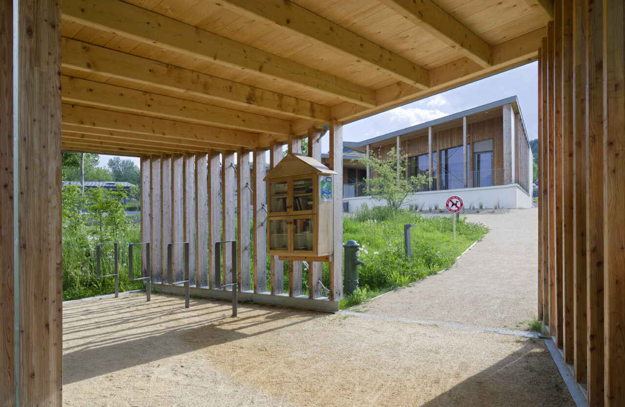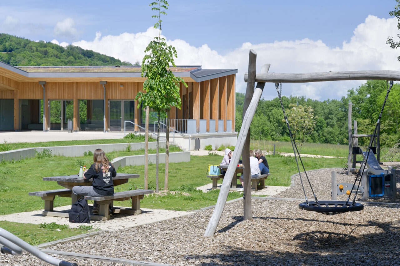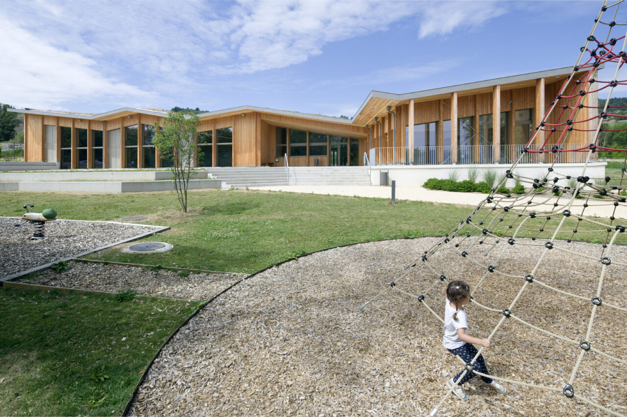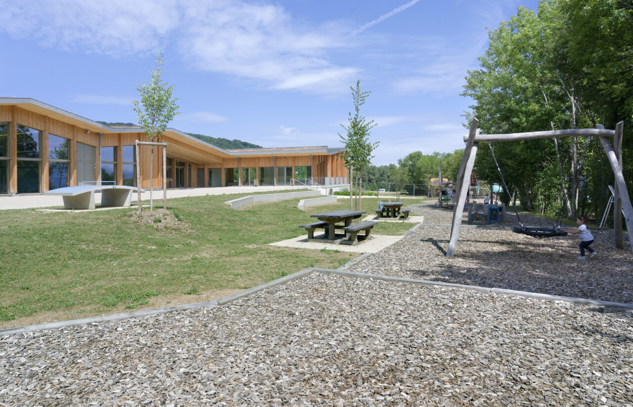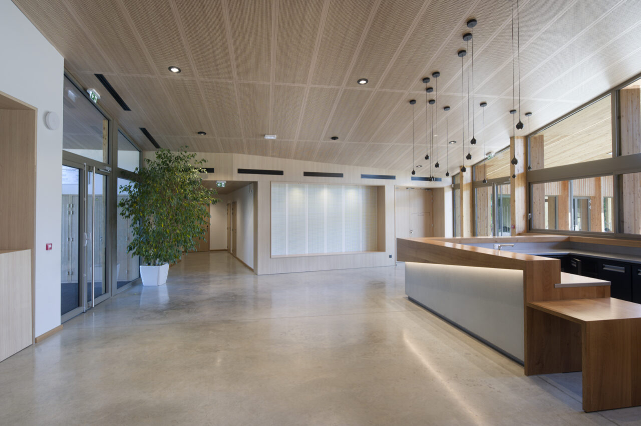 Les employés de la mairie se plaisent à le dire : Eteaux est au centre de la Haute-Savoie. En cette qualité, c’est un lieu stratégique pour se réunir à l’échelle départementale. Cette commune rurale de 2 200 habitants, contiguë à La Roche-sur-Foron, a par ailleurs une vie associative très fournie. De là a naturellement découlé, avec l’accompagnement du CAUE, la programmation foisonnante de cet « espace multifonction », véritable signal pour les personnes qui empruntent l’autoroute, en particulier à la tombée de la nuit lorsqu’il est éclairé. L’équipe municipale a mis un point d’honneur à ce que l’espace, polymorphe, puisse être le théâtre aussi bien de tennis de table, de danse, de réunions que de festivités. Tout projet se doit d’être relié à son territoire et accessible, d’autant plus lorsqu’il a vocation à être très sollicité. C’est pourquoi les modes doux sont encouragés par un cheminement pour les piétons et les vélos qui relie l’espace multifonction au centre d’Eteaux. Motivée par l’objectif d’inauguration lors des vœux en 2025, l’équipe orchestrée par AER Architectes a mené à bien ce chantier impressionnant d’un bâtiment de bois et de béton tourné vers les montagnes du Môle et de Sous-dine, qui ont donné leurs noms aux deux salles.