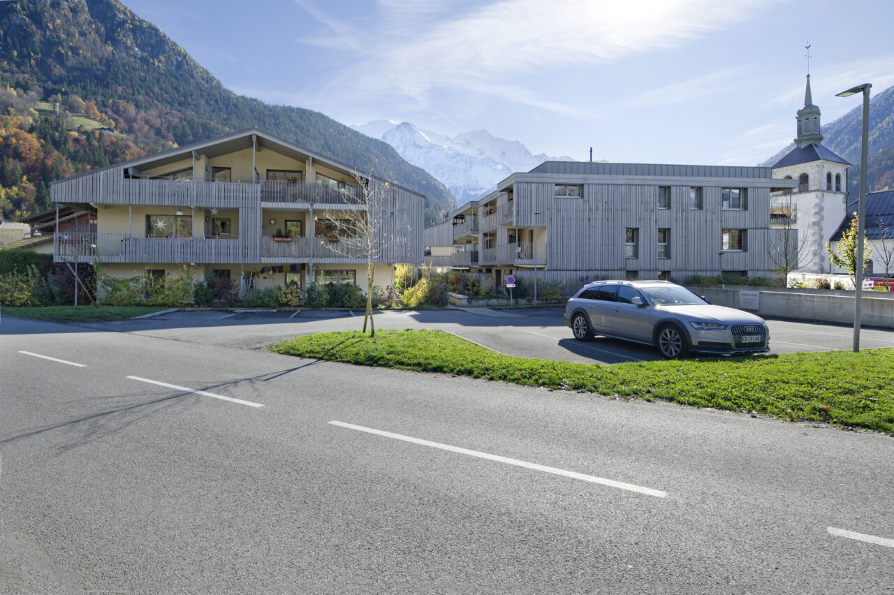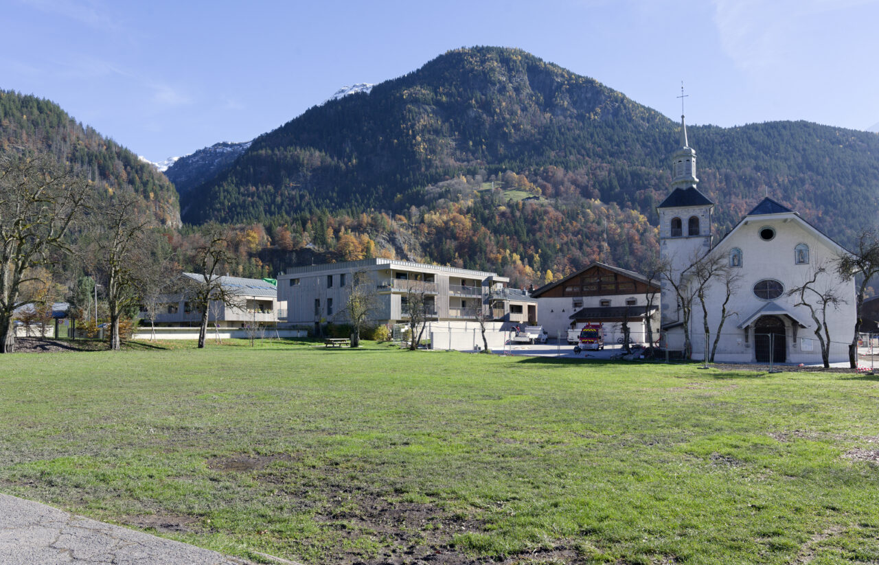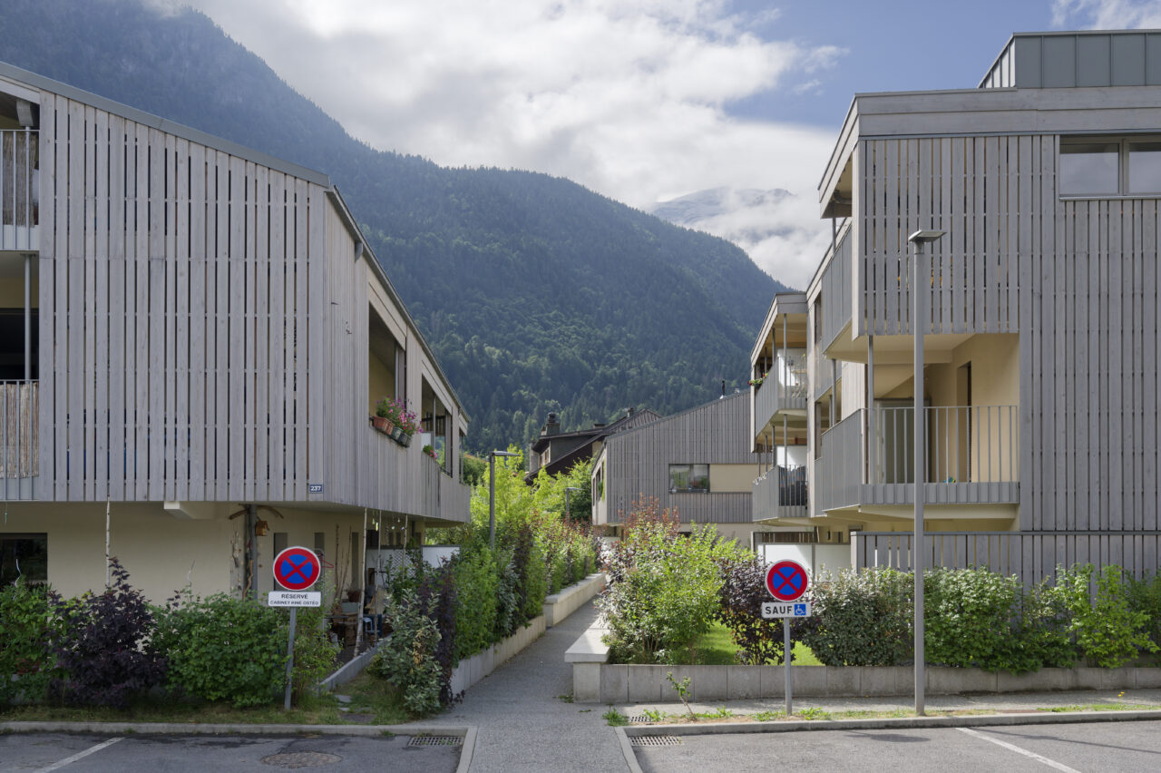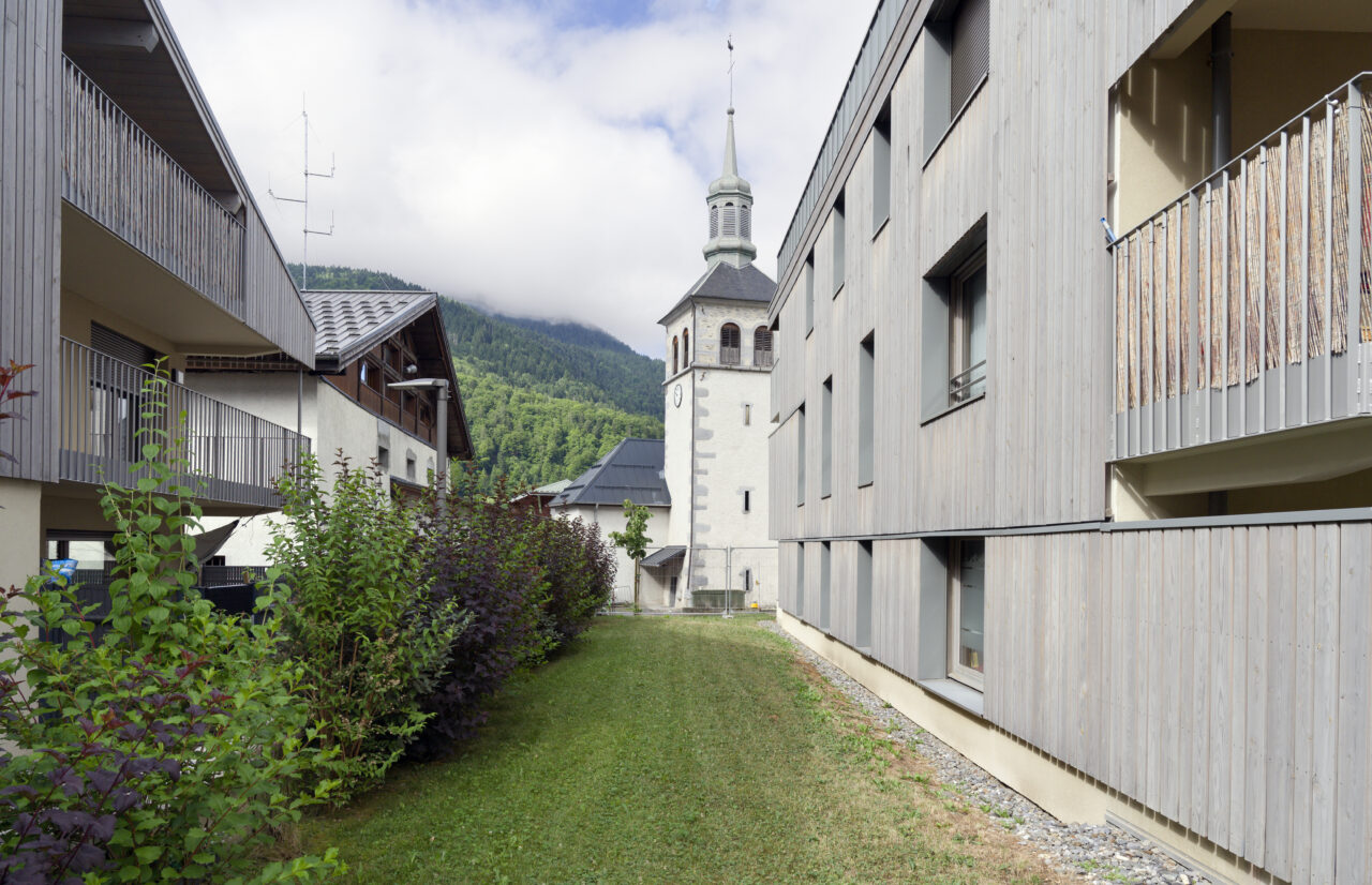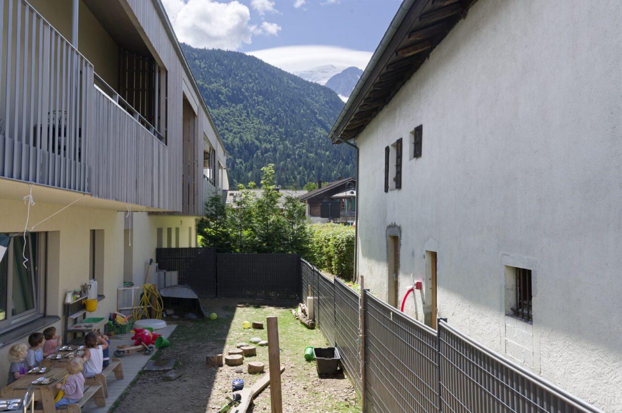 Servoz rassemble les caractéristiques d’un village alpin typique, aux hameaux dispersés. Le centre dense du village est relié au point de signal fort, constitué par l’église et son presbytère attenant, par le hameau des Reines. Cette opération portée par Sully immobilier, fruit d’une étroite collaboration entre la commune et ARIA architecture, s’inscrit dans une orientation d’aménagement et de programmation bien définie. Le nouveau hameau joue tout à fait son rôle de couture, à l’endroit où la densité du centre-village s’amorce, tout en s’estompant pour dialoguer avec la prairie libre et les vues vers les montagnes. La vraie qualité du projet réside dans sa capacité à proposer une nouvelle densité, mais qui semble avoir toujours été là. C’est avec surprise qu’on apprend que ce sont 38 logements dont 9 sociaux, des locaux de professionnels de santé et une micro-crèche qui sont abrités dans les trois bâtiments de l’opération. Pour autant, la sensation n’est nullement étouffante. Le hameau des Reines répond habilement au double enjeu d’offrir des vues aux résidents, tout en garantissant une densité de village. Une densité qui s’impose aujourd’hui pour libérer l’artificialisation des sols tout en offrant des logements aux personnes qui ont de plus en plus de difficultés à se loger à Chamonix par exemple. Le hameau a été rapidement peuplé, la preuve qu’il répondait à de forts enjeux du territoire. La micro-crèche a même une longue liste d’attente !