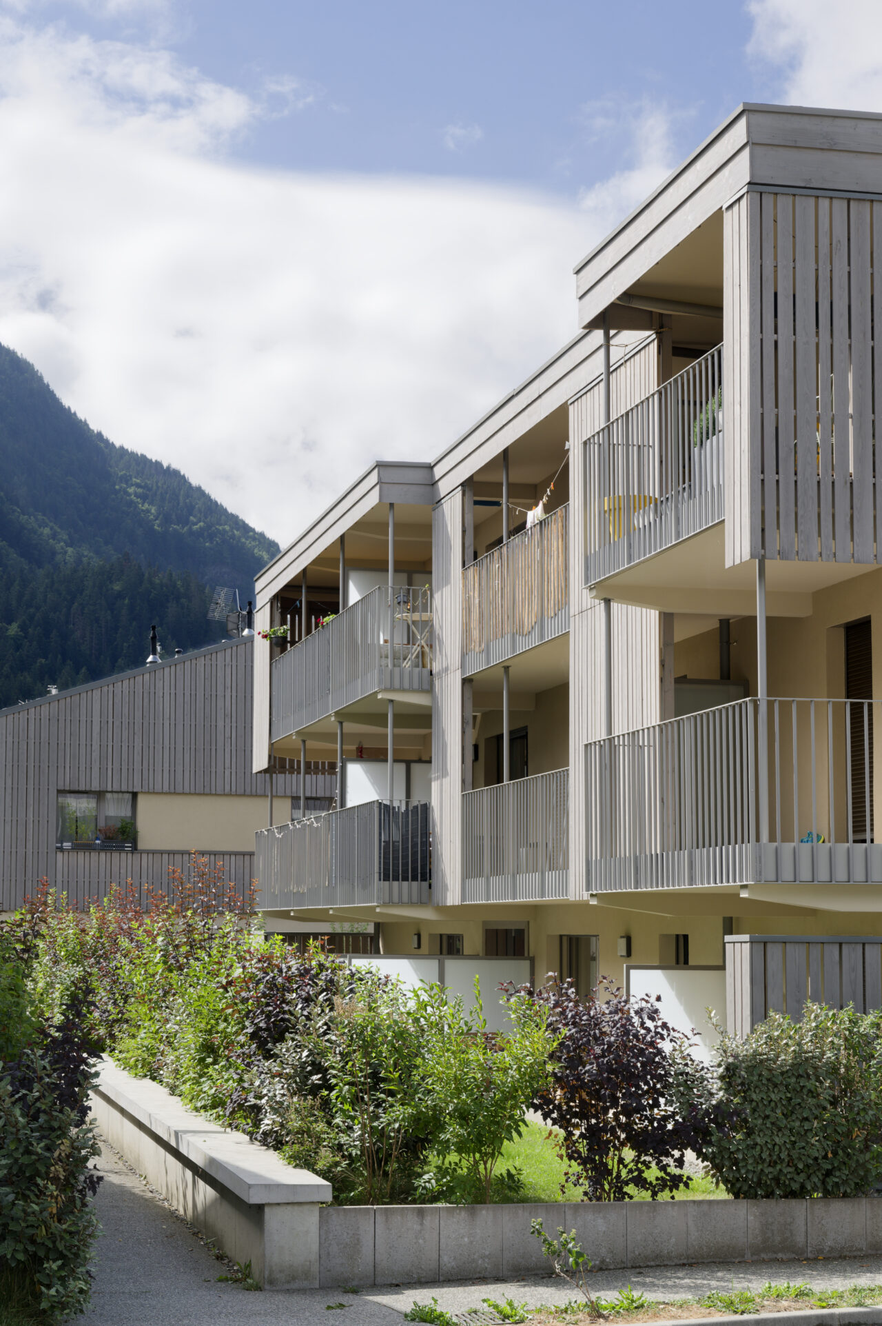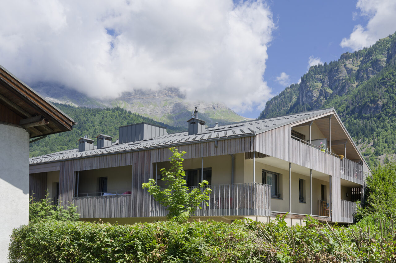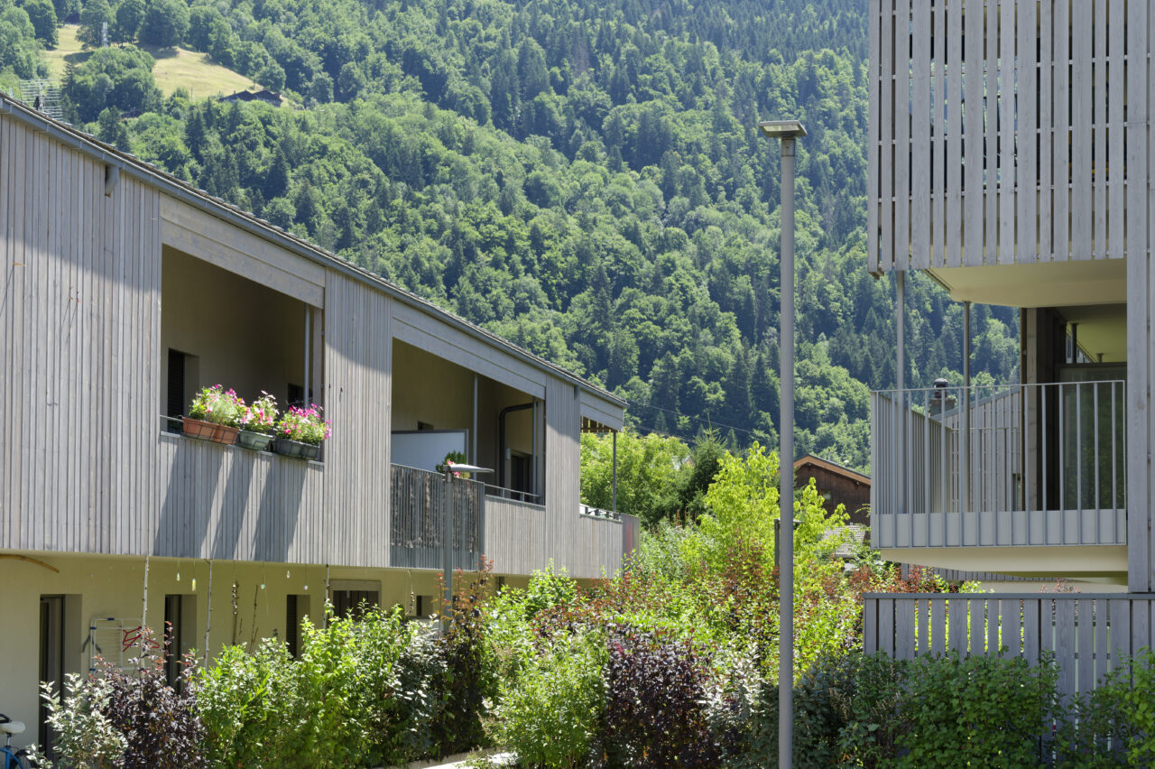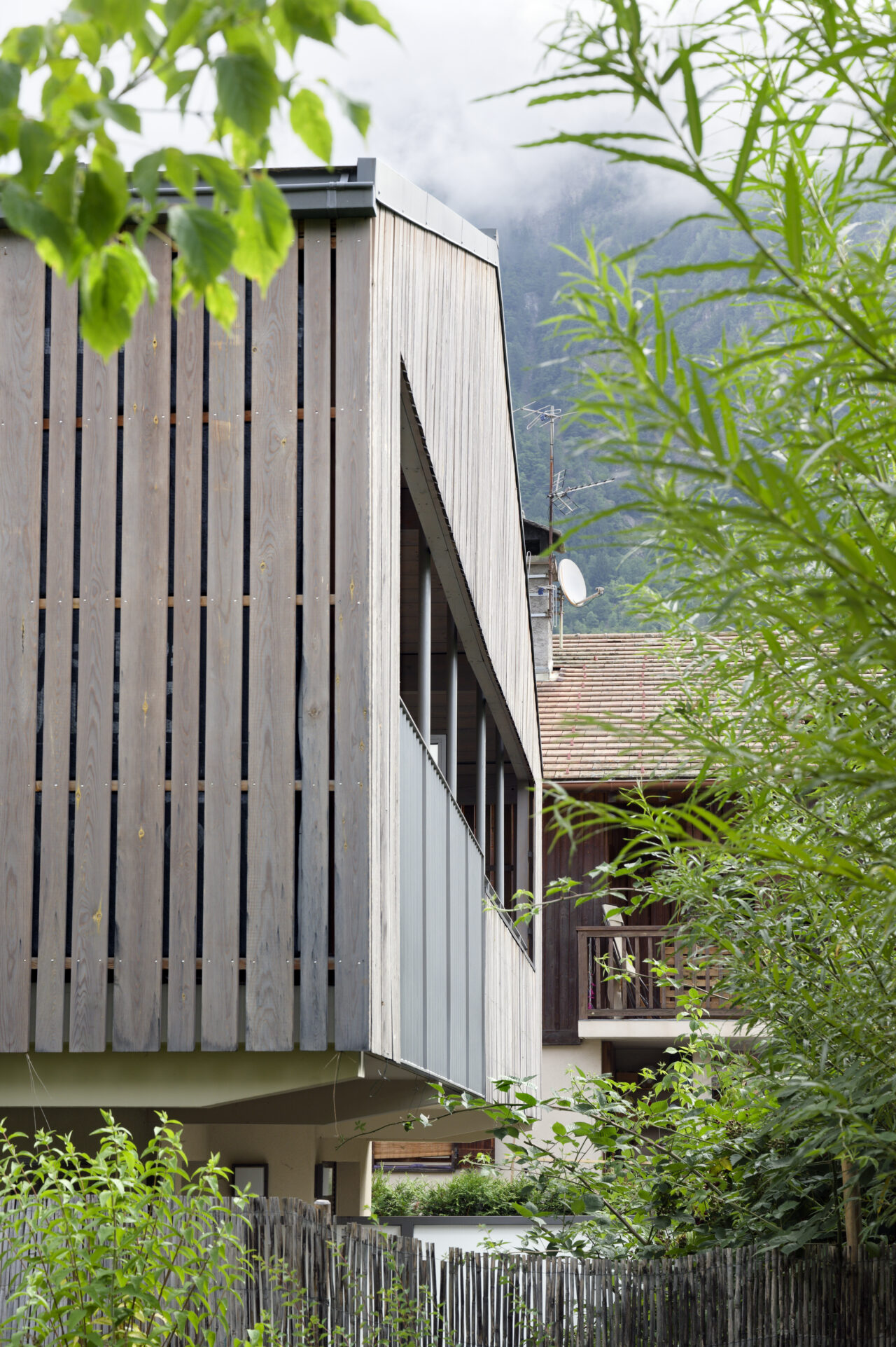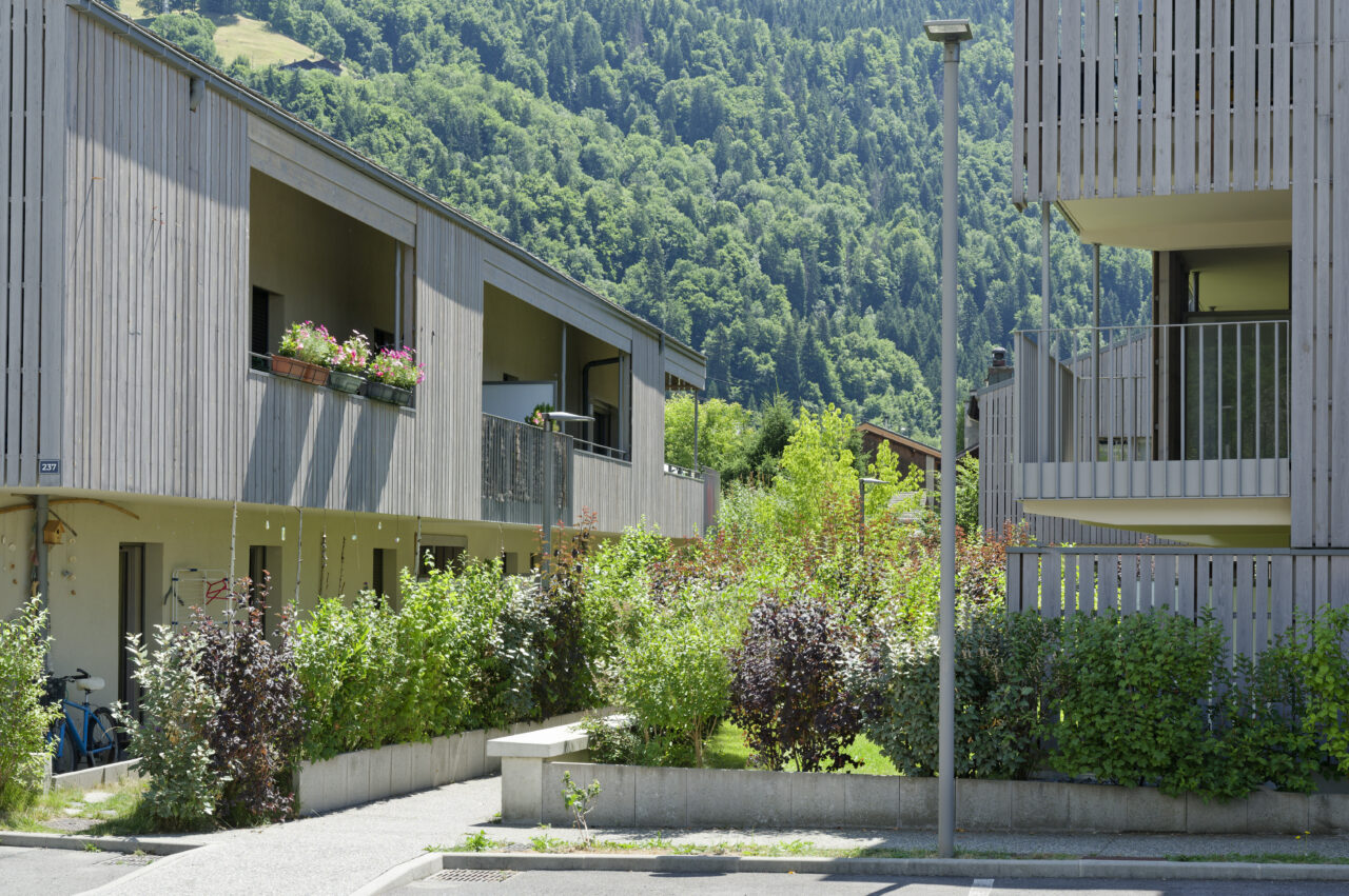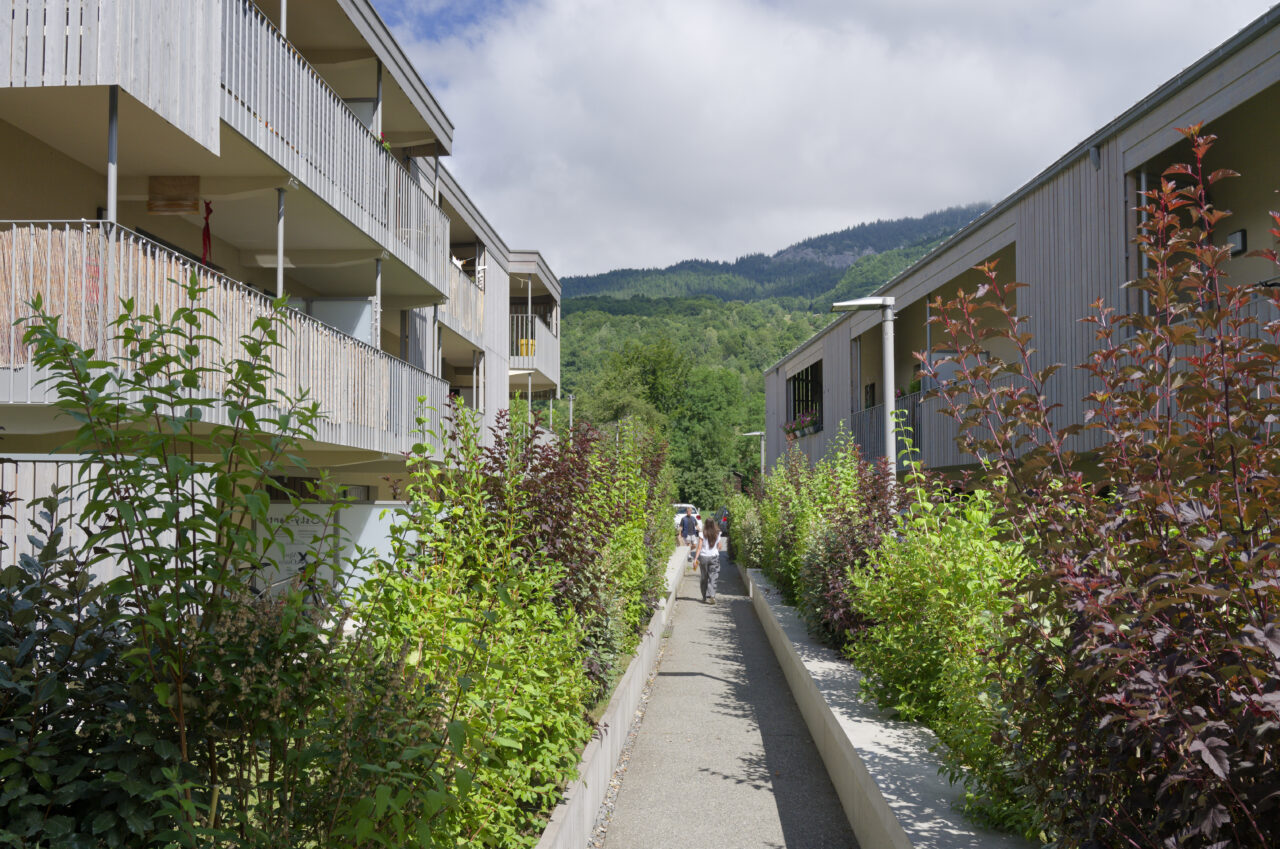 Servoz rassemble les caractéristiques d’un village alpin typique, aux hameaux dispersés. Le centre dense du village est relié au point de signal fort, constitué par l’église et son presbytère attenant, par le hameau des Reines. Cette opération portée par Sully immobilier, fruit d’une étroite collaboration entre la commune et ARIA architecture, s’inscrit dans une orientation d’aménagement et de programmation bien définie. Le nouveau hameau joue tout à fait son rôle de couture, à l’endroit où la densité du centre-village s’amorce, tout en s’estompant pour dialoguer avec la prairie libre et les vues vers les montagnes. La vraie qualité du projet réside dans sa capacité à proposer une nouvelle densité, mais qui semble avoir toujours été là. C’est avec surprise qu’on apprend que ce sont 38 logements dont 9 sociaux, des locaux de professionnels de santé et une micro-crèche qui sont abrités dans les trois bâtiments de l’opération. Pour autant, la sensation n’est nullement étouffante. Le hameau des Reines répond habilement au double enjeu d’offrir des vues aux résidents, tout en garantissant une densité de village. Une densité qui s’impose aujourd’hui pour libérer l’artificialisation des sols tout en offrant des logements aux personnes qui ont de plus en plus de difficultés à se loger à Chamonix par exemple. Le hameau a été rapidement peuplé, la preuve qu’il répondait à de forts enjeux du territoire. La micro-crèche a même une longue liste d’attente !
