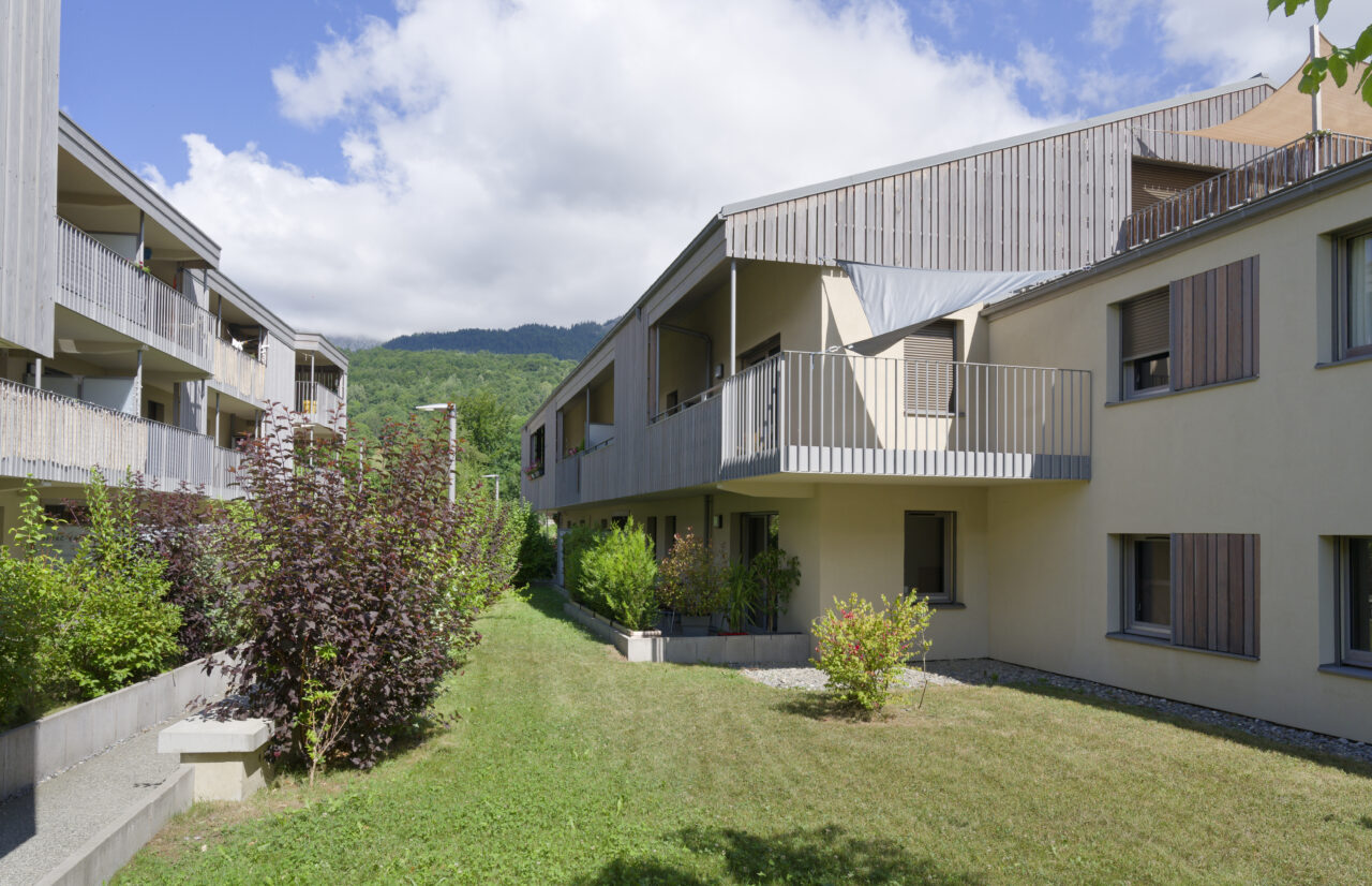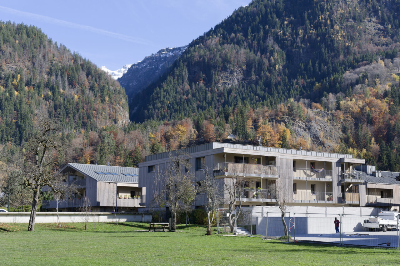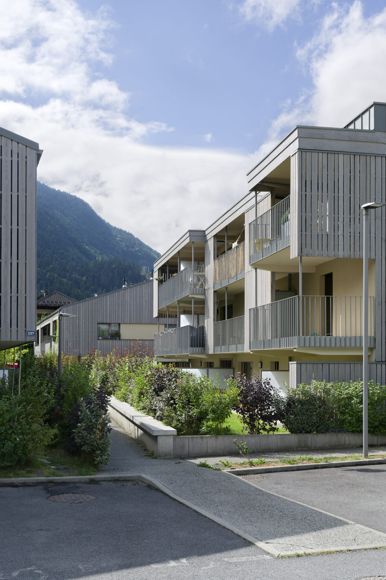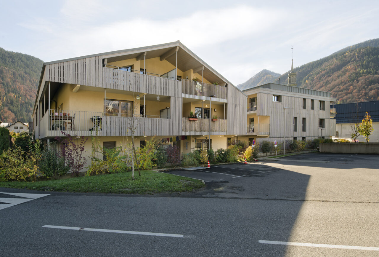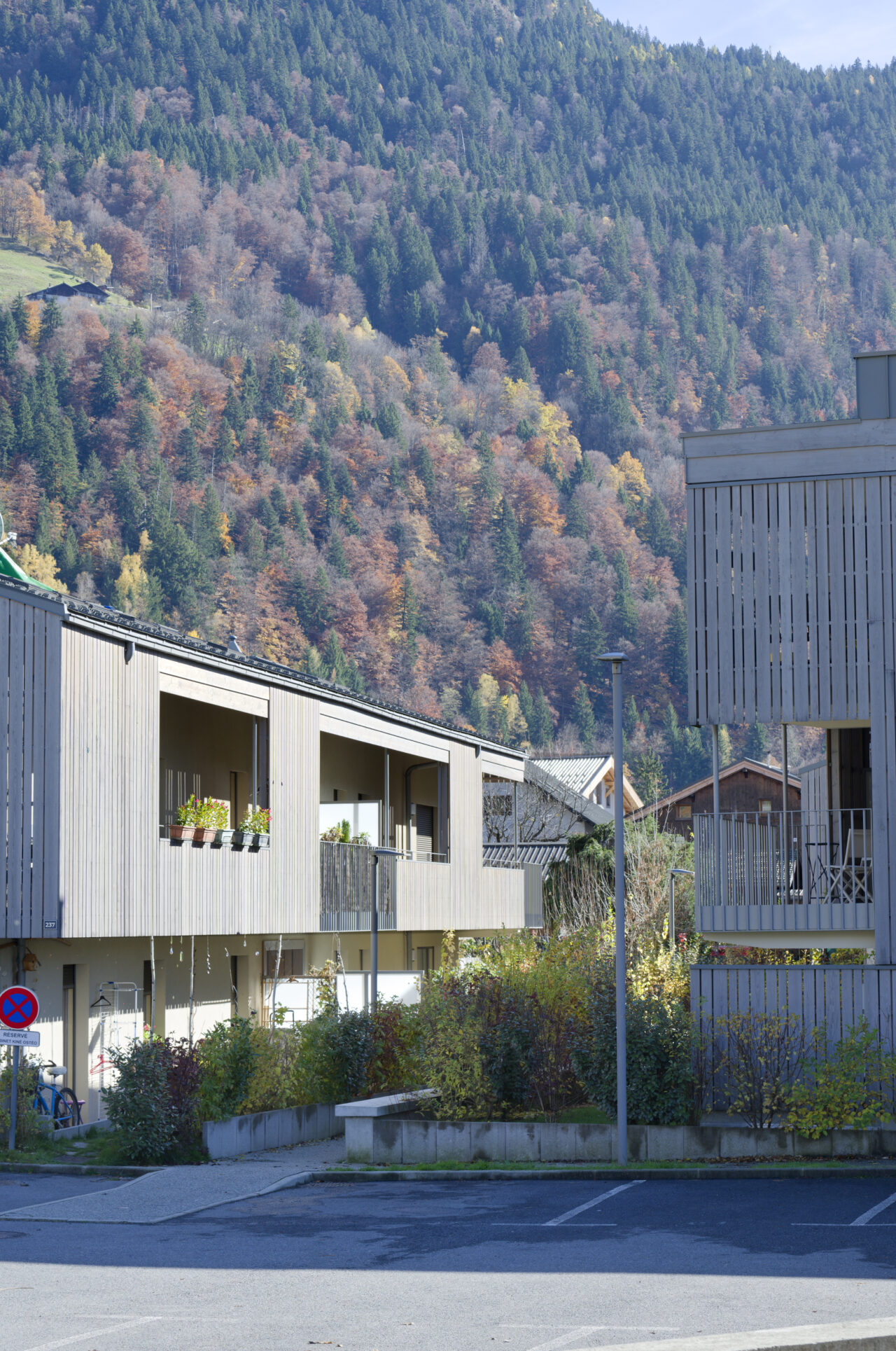 Servoz rassemble les caractéristiques d’un village alpin typique, aux hameaux dispersés. Le centre dense du village est relié au point de signal fort, constitué par l’église et son presbytère attenant, par le hameau des Reines. Cette opération portée par Sully immobilier, fruit d’une étroite collaboration entre la commune et ARIA architecture, s’inscrit dans une orientation d’aménagement et de programmation bien définie. Le nouveau hameau joue tout à fait son rôle de couture, à l’endroit où la densité du centre-village s’amorce, tout en s’estompant pour dialoguer avec la prairie libre et les vues vers les montagnes. La vraie qualité du projet réside dans sa capacité à proposer une nouvelle densité, mais qui semble avoir toujours été là. C’est avec surprise qu’on apprend que ce sont 38 logements dont 9 sociaux, des locaux de professionnels de santé et une micro-crèche qui sont abrités dans les trois bâtiments de l’opération. Pour autant, la sensation n’est nullement étouffante. Le hameau des Reines répond habilement au double enjeu d’offrir des vues aux résidents, tout en garantissant une densité de village. Une densité qui s’impose aujourd’hui pour libérer l’artificialisation des sols tout en offrant des logements aux personnes qui ont de plus en plus de difficultés à se loger à Chamonix par exemple. Le hameau a été rapidement peuplé, la preuve qu’il répondait à de forts enjeux du territoire. La micro-crèche a même une longue liste d’attente !