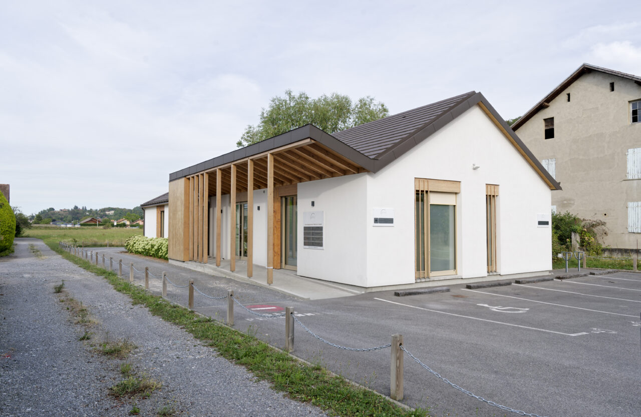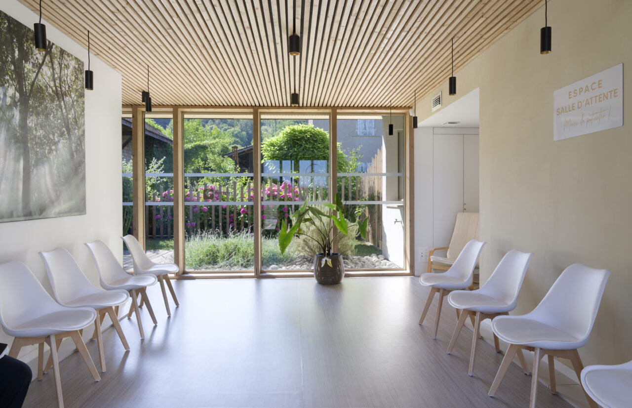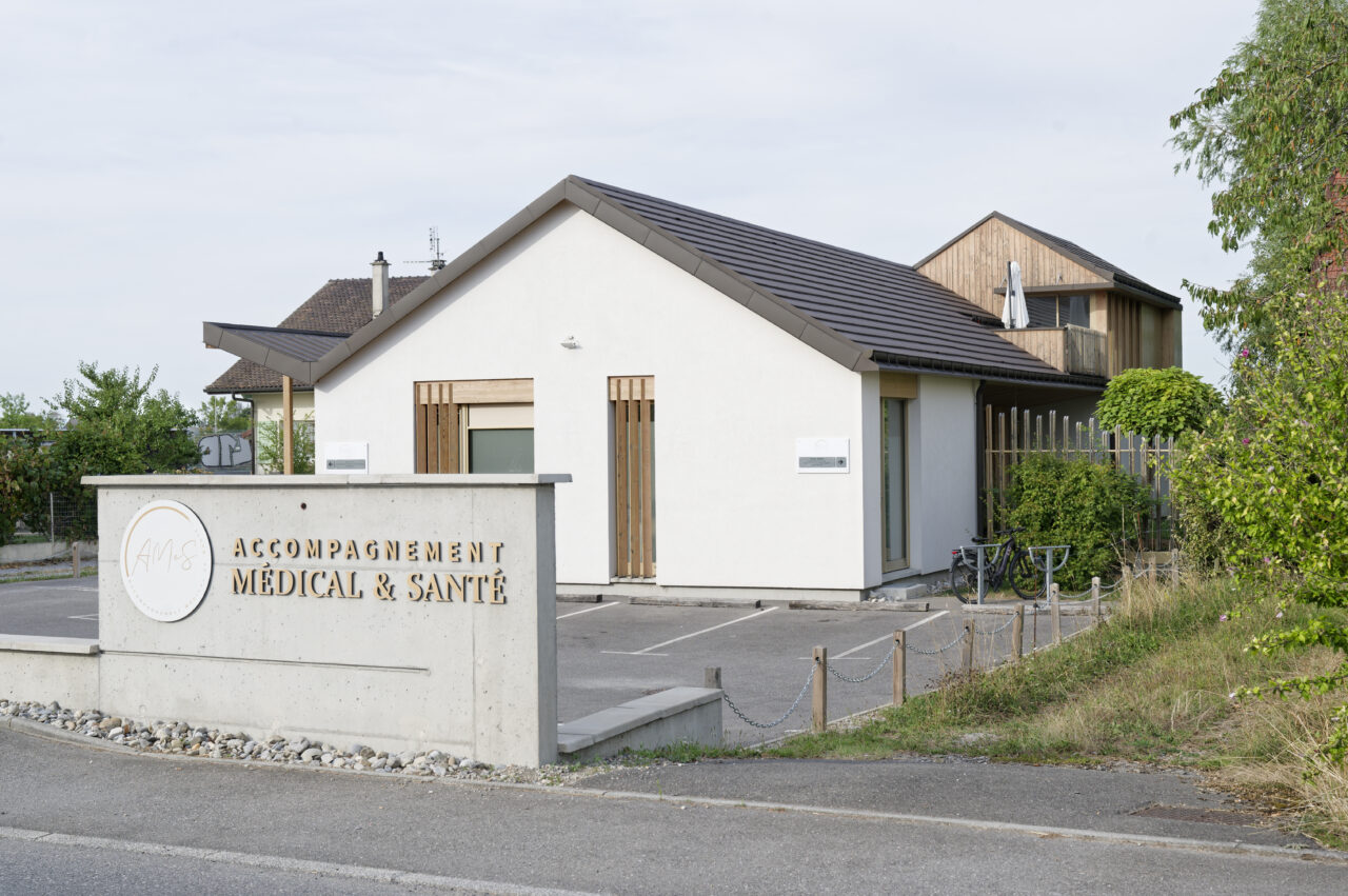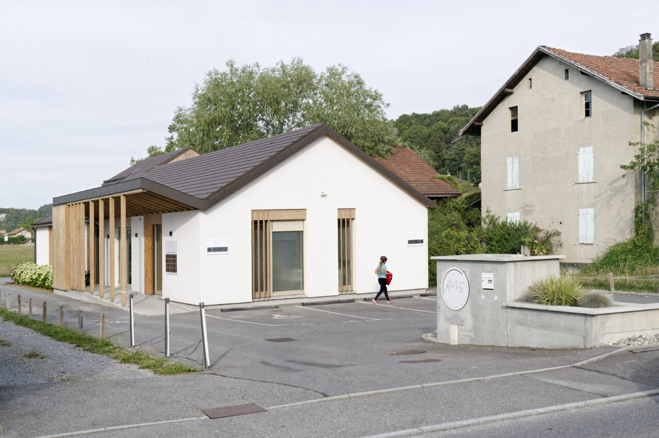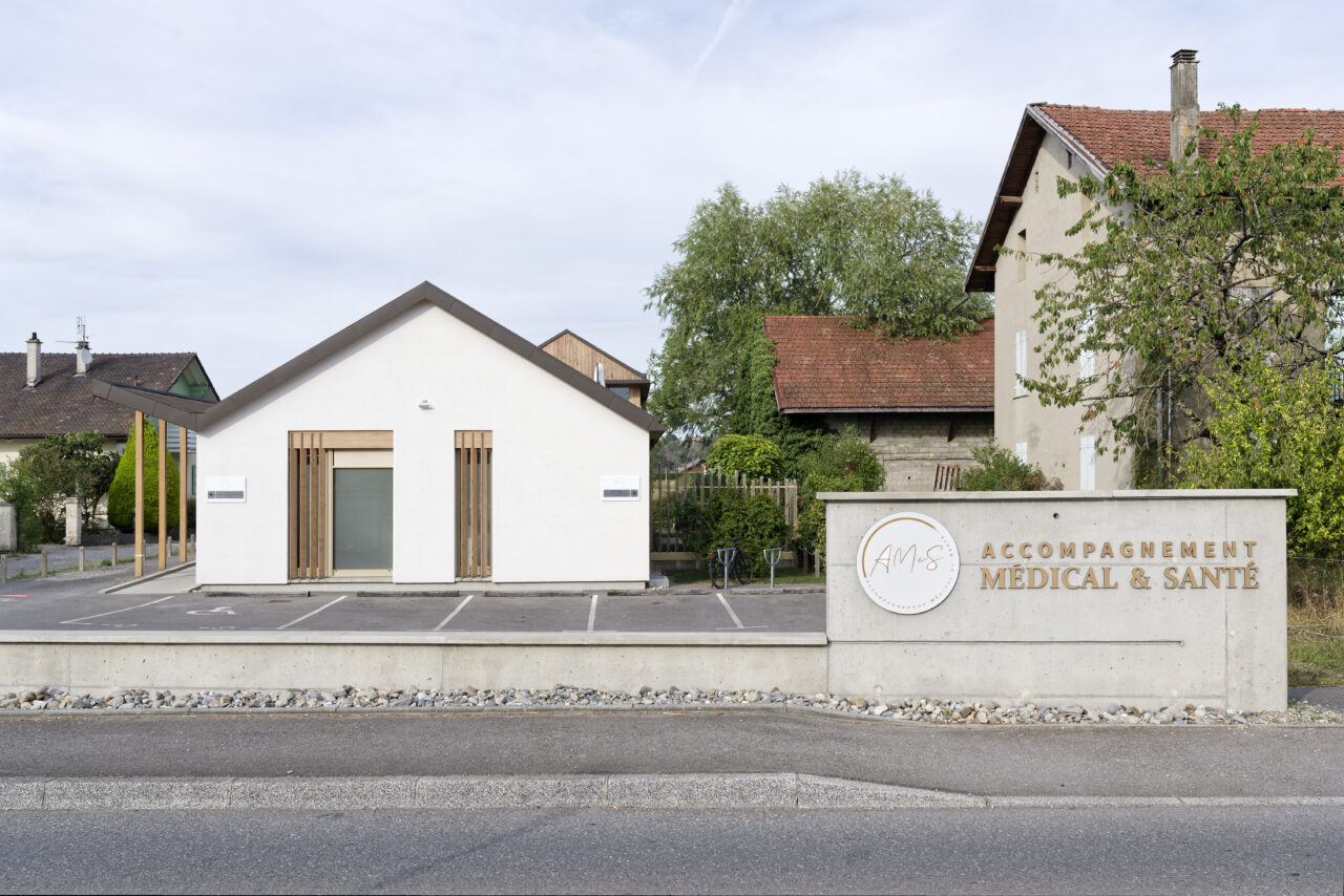 En bordure de Thonon-les-Bains, un bâtiment discret prend soin de la patientèle qui le fréquente, des personnes qui y travaillent et de l’environnement. Quand on franchit le seuil de la maison médicale de la femme et de l’enfant, on baigne dans une atmosphère bienveillante et apaisante malgré la proximité des axes très fréquentés. Ce projet est le fruit du travail étroit entre une SCI (montée par deux sage-femmes et une ostéopathe) et l’architecte Audrey Maxit. Il rassemble, outre les espaces d’accueil et d’attente, les sanitaires et locaux techniques, sept bureaux de consultation, une salle commune de préparation à l’accouchement, une salle d’échographie et une salle de repos du personnel. À deux minutes de l’hôpital de Thonon, le centre, au service de la santé, se distingue d’un univers médical qui serait purement fonctionnel voire froid. Le dessin du bâtiment se ressent comme une découverte progressive, depuis l’extérieur où le bâtiment allongé s’insère par sa volumétrie et ses toitures à deux pans inclinés comme ceux des fermes genevoises, jusqu’au patio qui structure l’intérieur, et enfin à l’annexe située à l’étage. En fin de compte, ces espaces chaleureux, dont on parcourt le linoléum pieds nus, allient « beauté, praticité, calme et confort » selon ses occupantes et la maîtrise d’ouvrage.