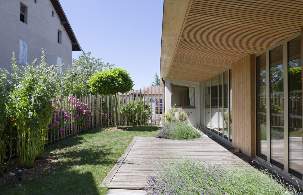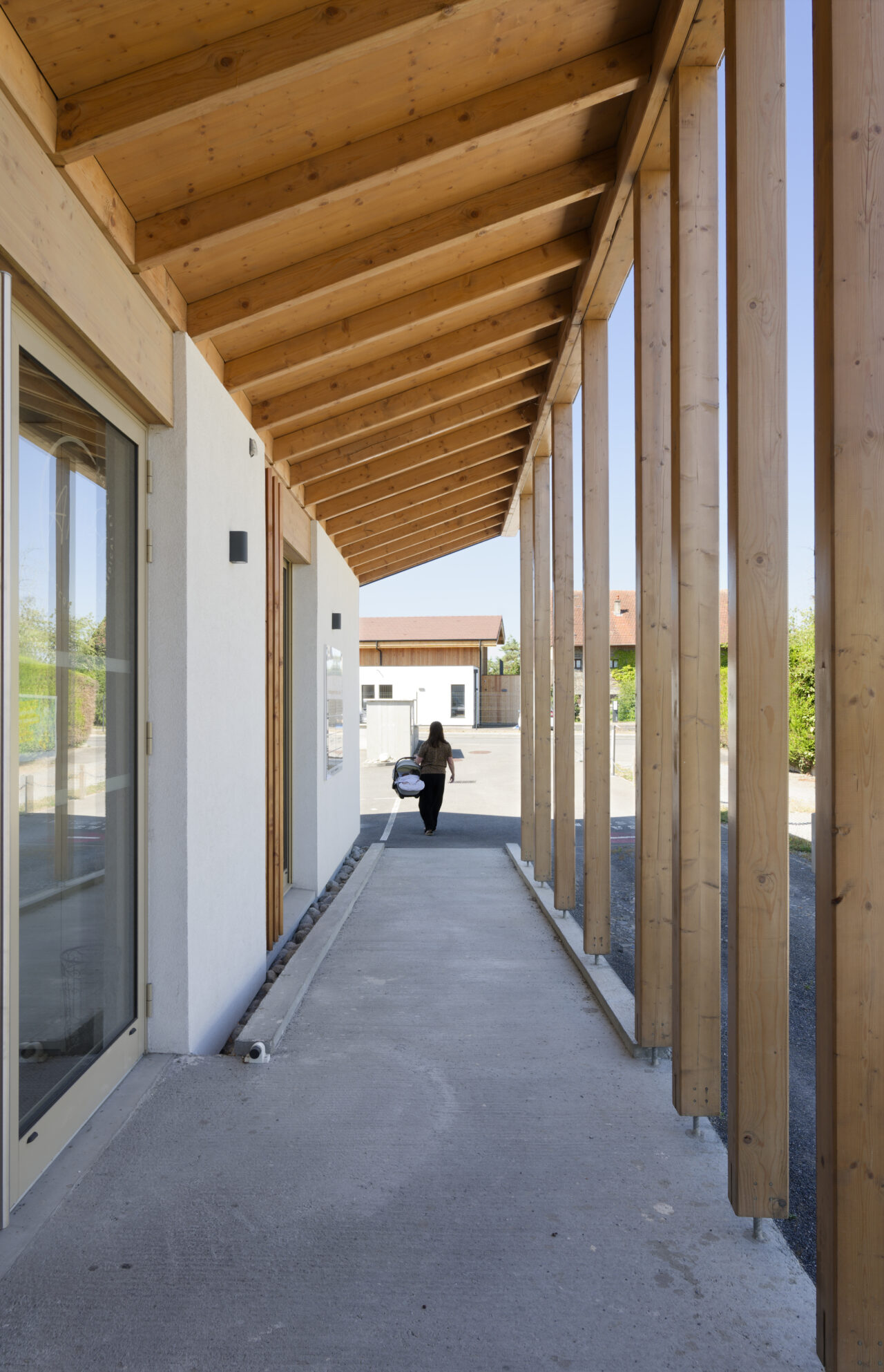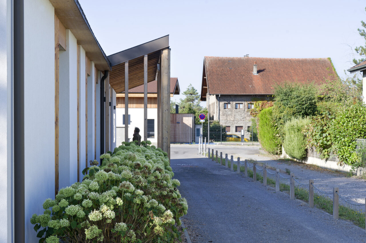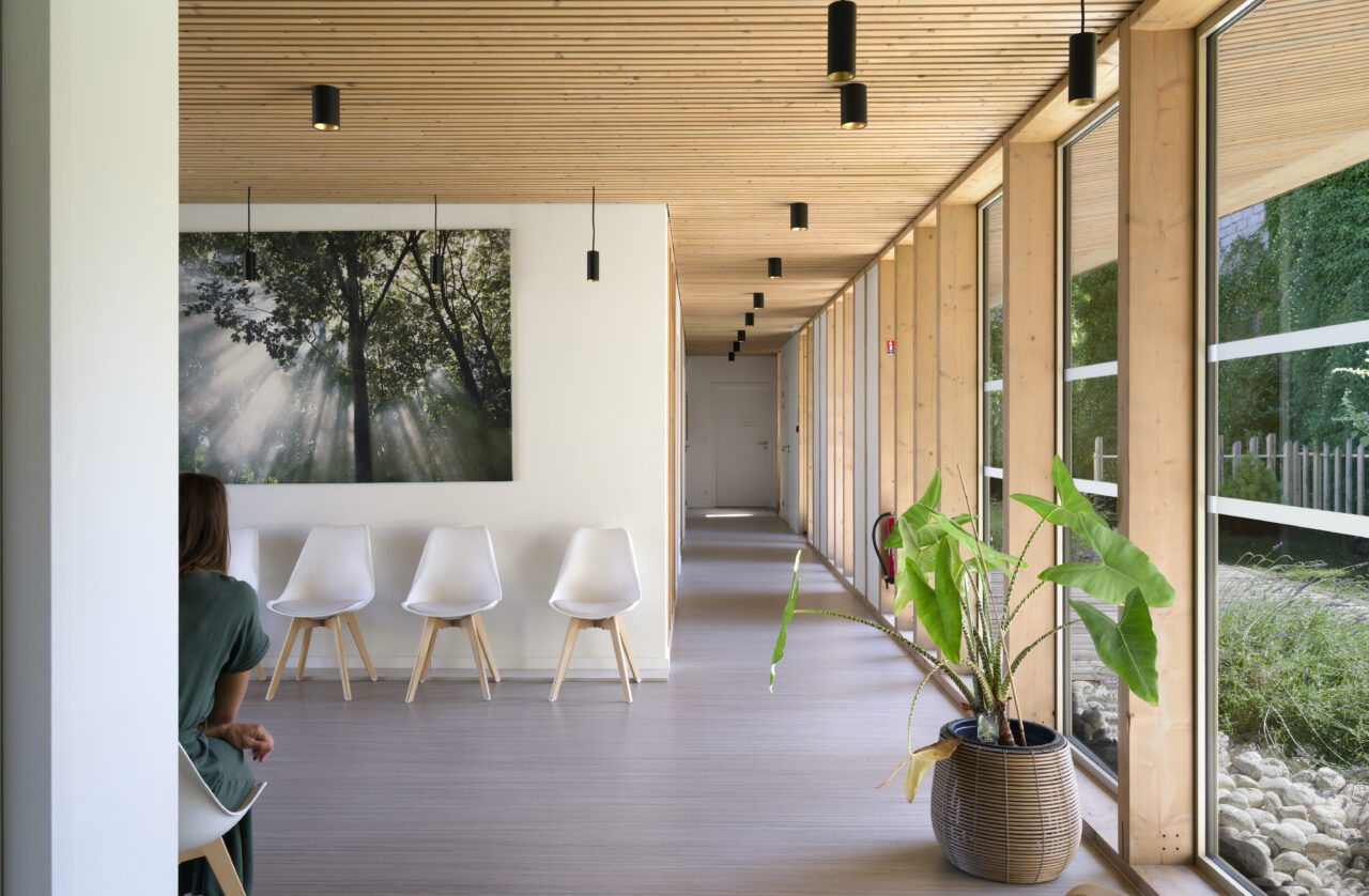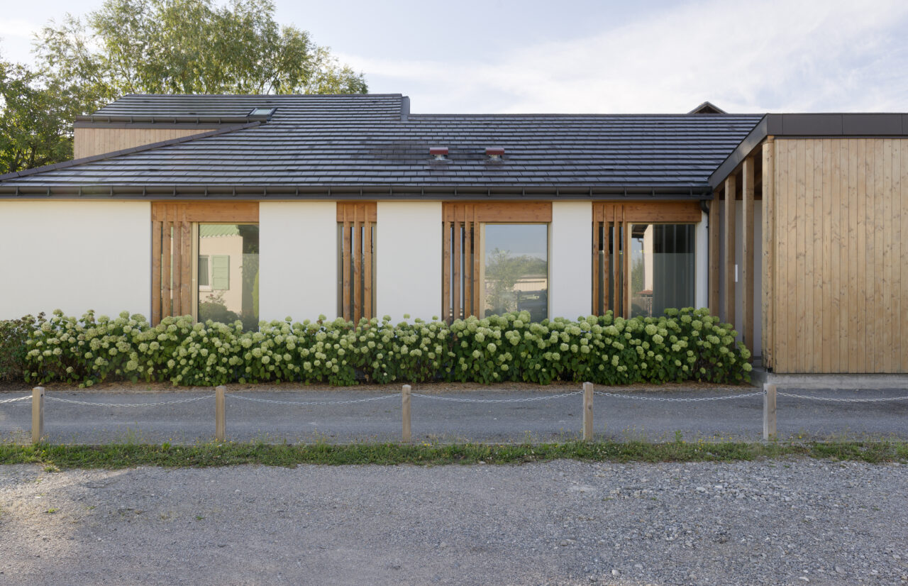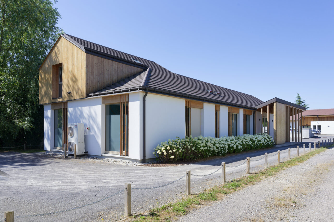 En bordure de Thonon-les-Bains, un bâtiment discret prend soin de la patientèle qui le fréquente, des personnes qui y travaillent et de l’environnement. Quand on franchit le seuil de la maison médicale de la femme et de l’enfant, on baigne dans une atmosphère bienveillante et apaisante malgré la proximité des axes très fréquentés. Ce projet est le fruit du travail étroit entre une SCI (montée par deux sage-femmes et une ostéopathe) et l’architecte Audrey Maxit. Il rassemble, outre les espaces d’accueil et d’attente, les sanitaires et locaux techniques, sept bureaux de consultation, une salle commune de préparation à l’accouchement, une salle d’échographie et une salle de repos du personnel. À deux minutes de l’hôpital de Thonon, le centre, au service de la santé, se distingue d’un univers médical qui serait purement fonctionnel voire froid. Le dessin du bâtiment se ressent comme une découverte progressive, depuis l’extérieur où le bâtiment allongé s’insère par sa volumétrie et ses toitures à deux pans inclinés comme ceux des fermes genevoises, jusqu’au patio qui structure l’intérieur, et enfin à l’annexe située à l’étage. En fin de compte, ces espaces chaleureux, dont on parcourt le linoléum pieds nus, allient « beauté, praticité, calme et confort » selon ses occupantes et la maîtrise d’ouvrage.