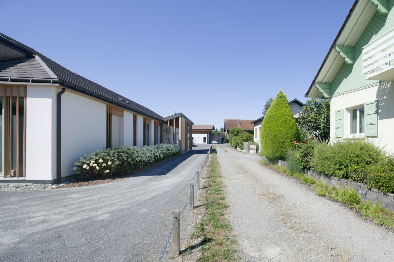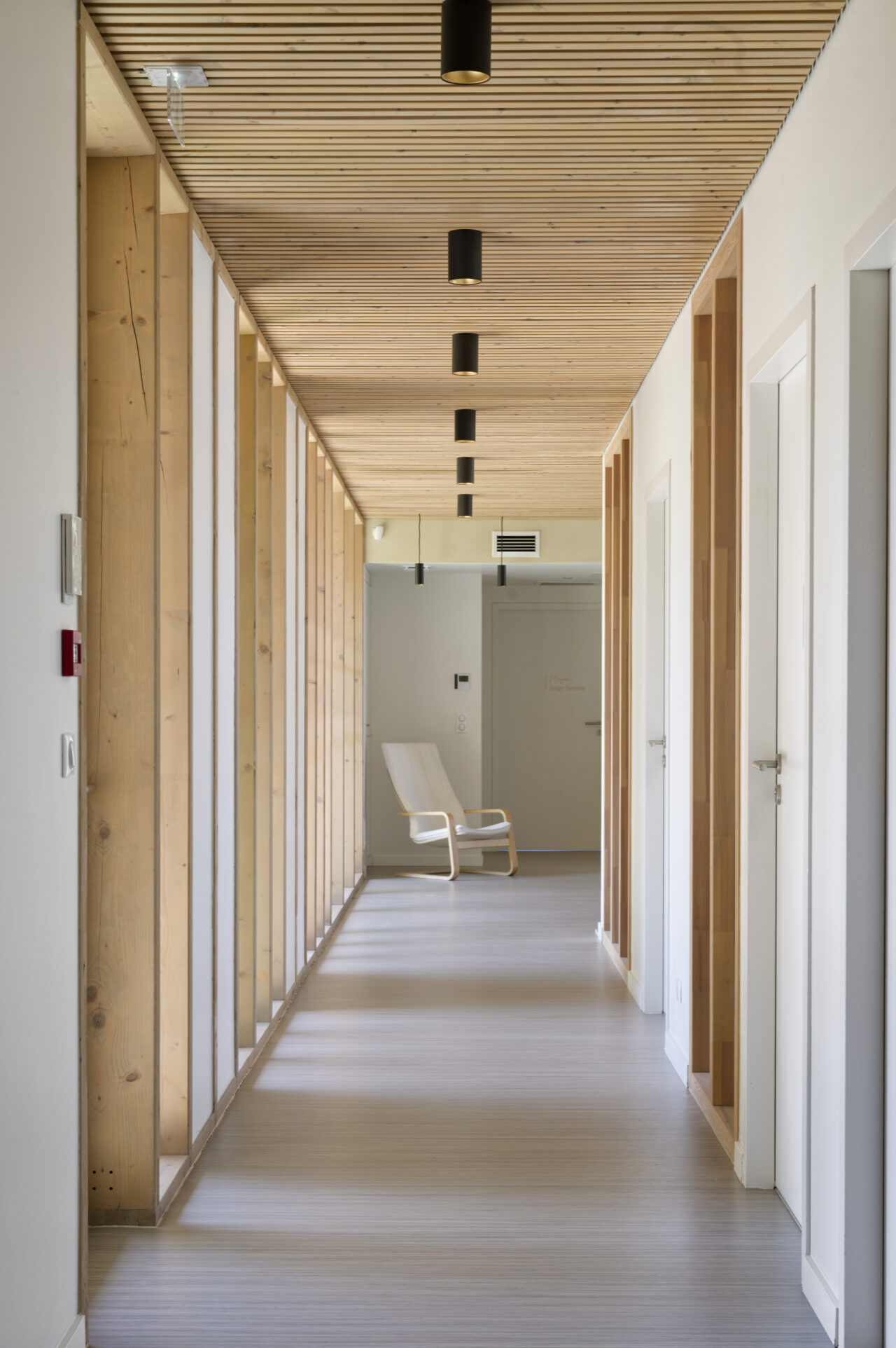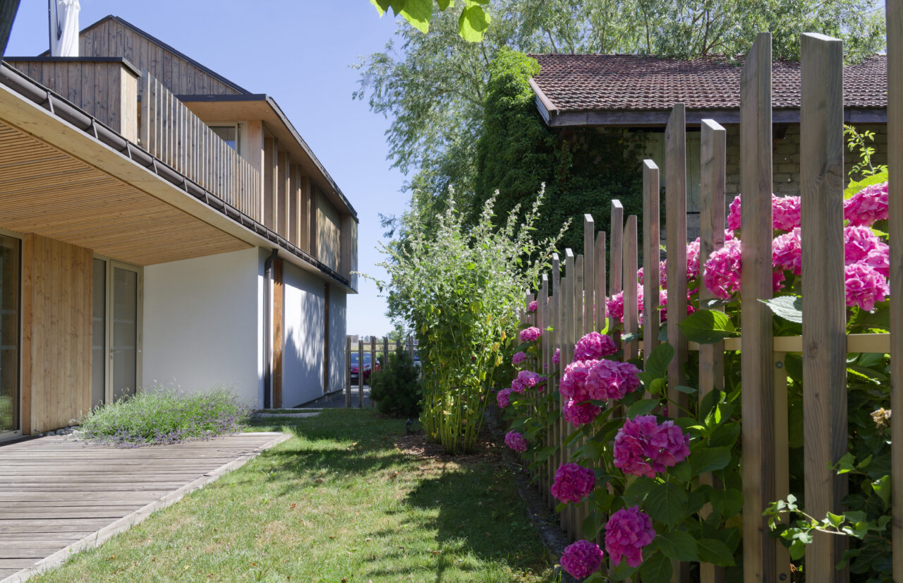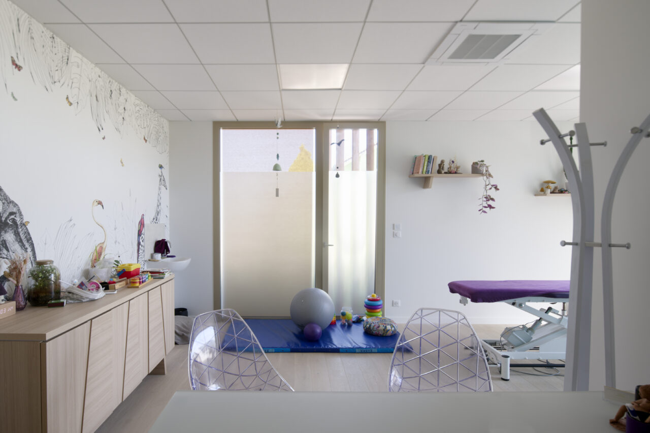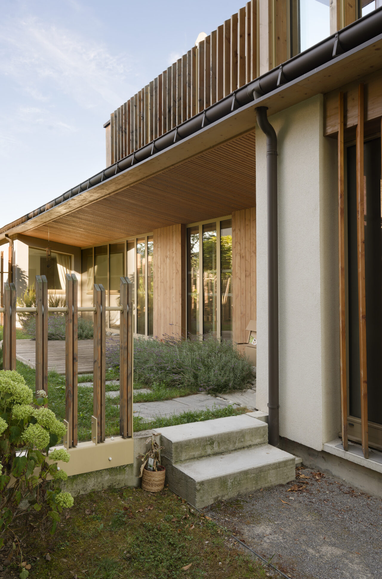 En bordure de Thonon-les-Bains, un bâtiment discret prend soin de la patientèle qui le fréquente, des personnes qui y travaillent et de l’environnement. Quand on franchit le seuil de la maison médicale de la femme et de l’enfant, on baigne dans une atmosphère bienveillante et apaisante malgré la proximité des axes très fréquentés. Ce projet est le fruit du travail étroit entre une SCI (montée par deux sage-femmes et une ostéopathe) et l’architecte Audrey Maxit. Il rassemble, outre les espaces d’accueil et d’attente, les sanitaires et locaux techniques, sept bureaux de consultation, une salle commune de préparation à l’accouchement, une salle d’échographie et une salle de repos du personnel. À deux minutes de l’hôpital de Thonon, le centre, au service de la santé, se distingue d’un univers médical qui serait purement fonctionnel voire froid. Le dessin du bâtiment se ressent comme une découverte progressive, depuis l’extérieur où le bâtiment allongé s’insère par sa volumétrie et ses toitures à deux pans inclinés comme ceux des fermes genevoises, jusqu’au patio qui structure l’intérieur, et enfin à l’annexe située à l’étage. En fin de compte, ces espaces chaleureux, dont on parcourt le linoléum pieds nus, allient « beauté, praticité, calme et confort » selon ses occupantes et la maîtrise d’ouvrage.