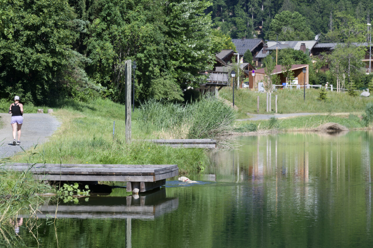 La base de loisirs des Houches adossée au Mont Lachat se déploie discrètement autour du lac, issu de l’extraction de roches pour la construction de l’autoroute du Mont-Blanc. Les paysagistes ont su trouver le juste milieu pour s’effacer devant le spectacle grandiose du Mont-Blanc tout en conférant une identité visuelle cohérente au lieu. Le programme mis au point avec le CAUE demandait de résoudre une équation complexe : garantir un accueil à toutes les saisons, offrir un panel d’activités ludiques et sportives à destination des résidents locaux comme des publics temporaires, le tout dans une zone classée naturelle – et avec un budget limité. En dix ans, le village a vu sa population tripler et donc ses équipements publics plus sollicités : pour la base de loisirs, très appréciée, il s’agissait pour la commune de ne pas apporter une réponse au coup par coup, peu satisfaisante face aux déficits d’aménagement. Le choix des paysagistes de l’agence LJN s’est donc porté sur un plan guide, esquissant des aménagements progressifs avec une vision d’ensemble. De tels sites connaissent d’importantes variations de fréquentation, ce qui a nécessité de porter une attention accrue à la qualité esthétique et fonctionnelle des espaces de circulation, de stationnement et au dessin des mobiliers. Un fil conducteur que les paysagistes ont tenu avec brio, donnant le sentiment que les aménagements ont toujours été là.