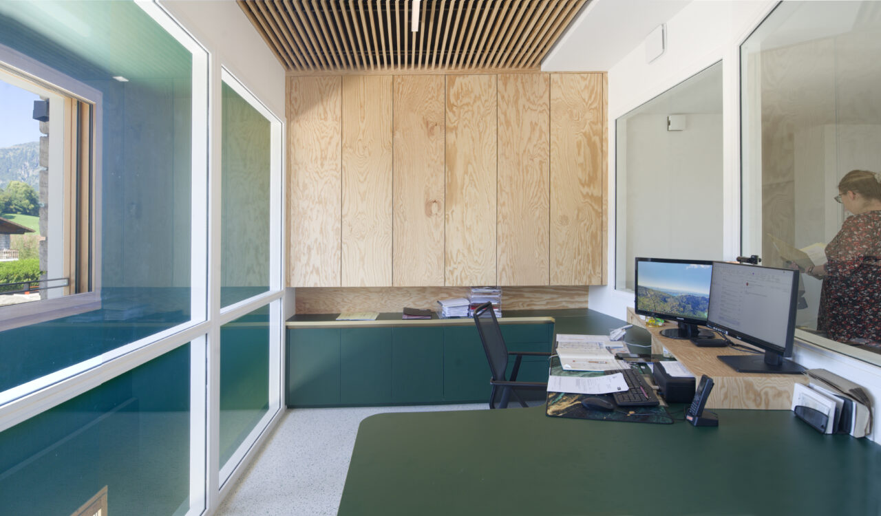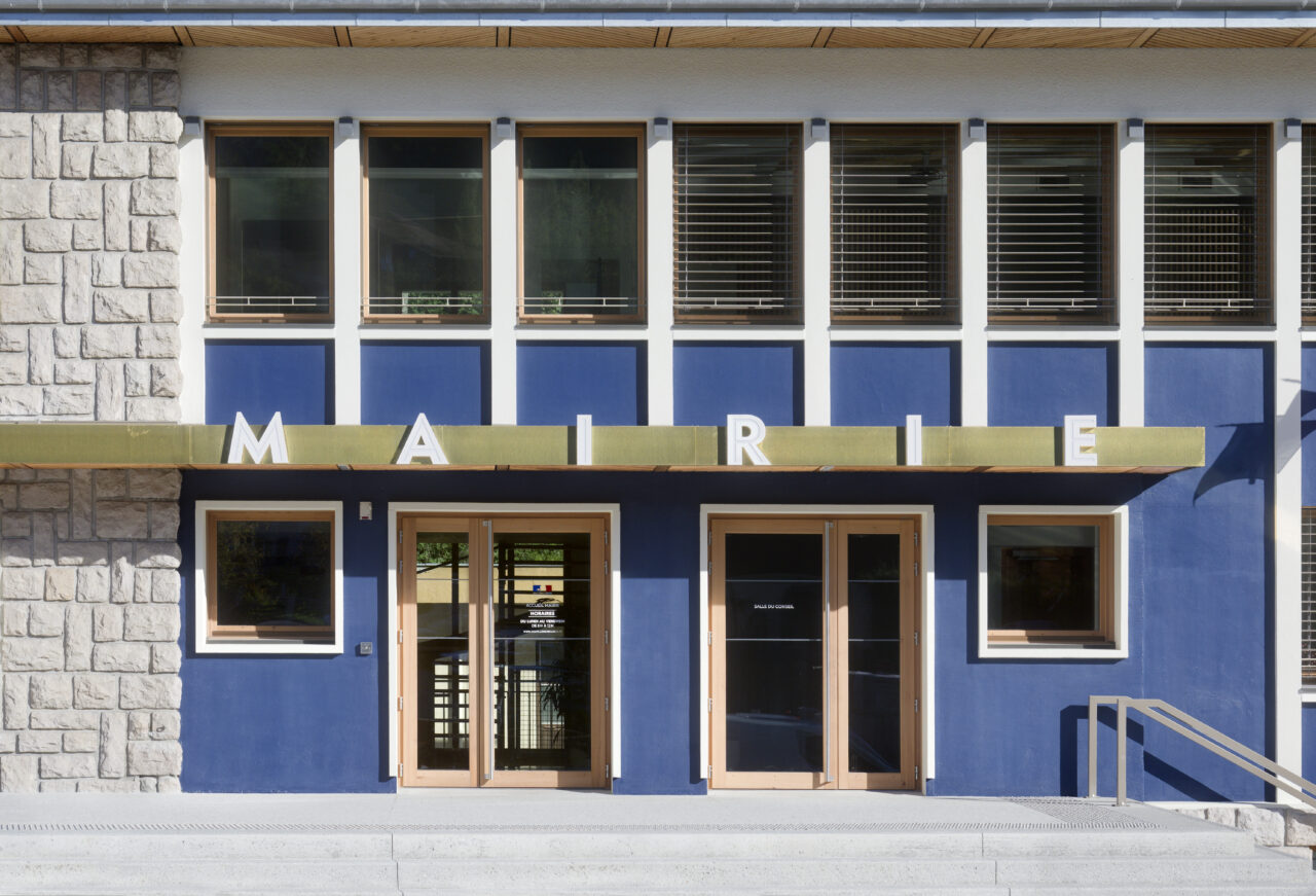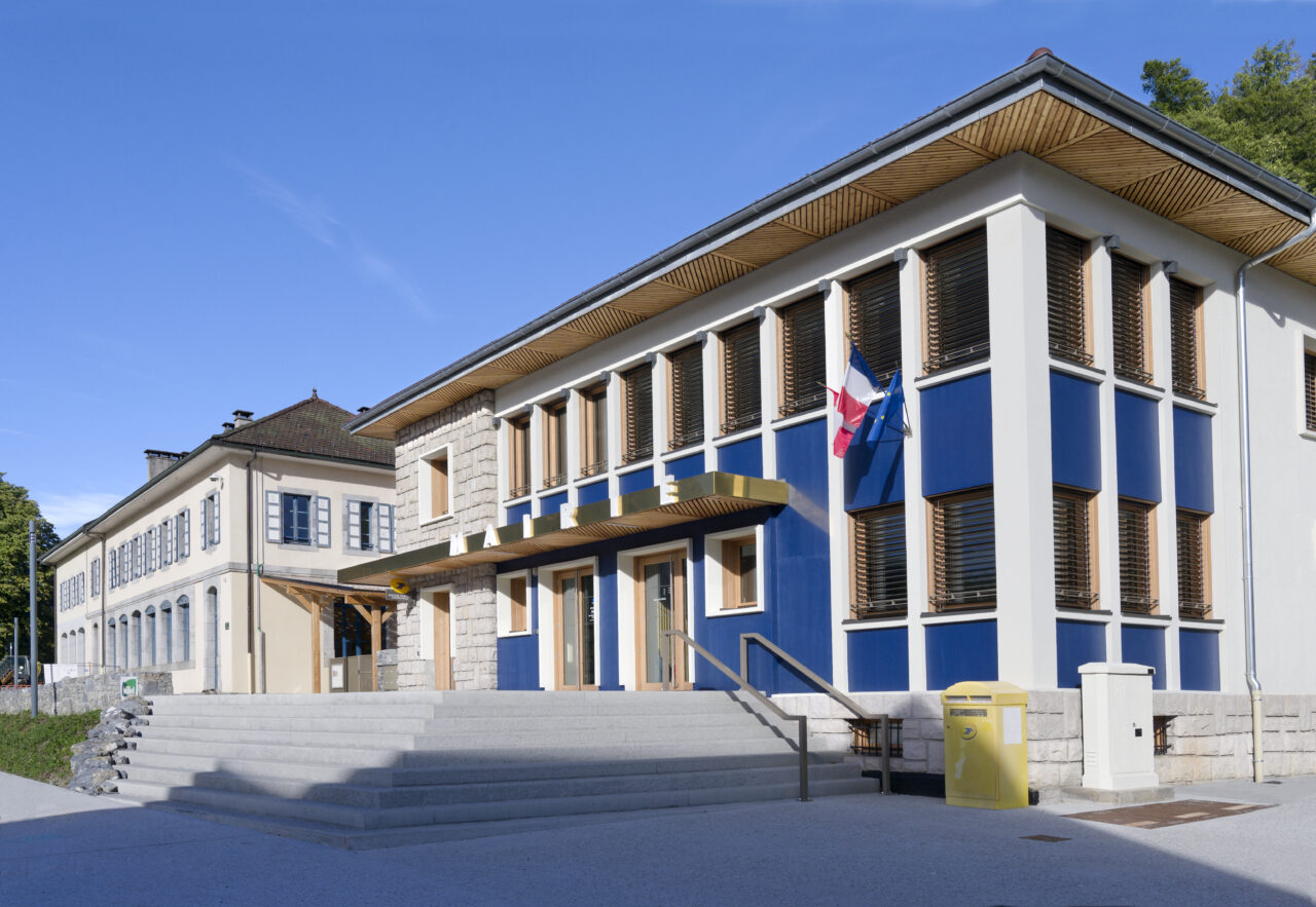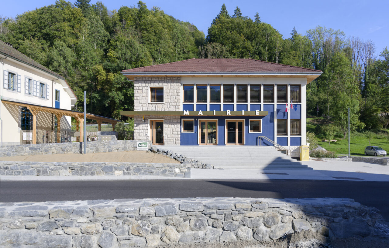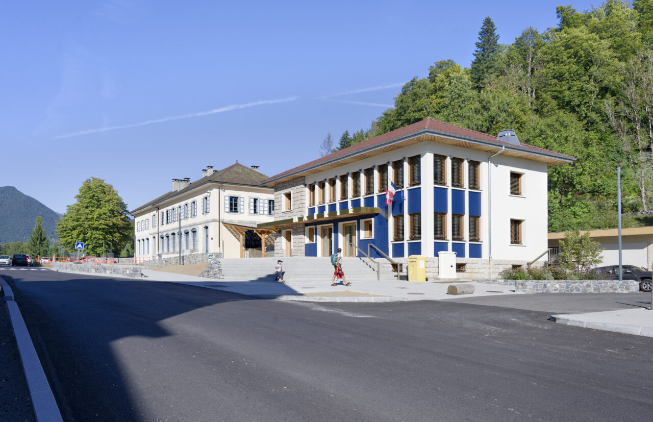 Le col de Châtillon-sur-Cluses est à la fois un seuil géographique entre la vallée de l’Arve et celle du Giffre ainsi qu’un lieu de passage historique, aujourd’hui marqué par l’omniprésence des véhicules. La municipalité s’est bien saisie de cette situation délicate et a cherché comment en faire un réel lieu d’arrêt. Plus encore, il s’agissait de penser la porte d’entrée d’un territoire, celui des montagnes du Giffre. C’est pourquoi la rénovation de la mairie, qui trône en bordure de la route départementale, s’inscrit dans un projet global d’aménagement du col. La mairie et son parvis y retrouvent leur posture de signal, dialoguant avec les éléments architecturaux et paysagers : le pic du Marcelly, le Bargy, tout comme les ruines du château, le clocher de l’église et le bâtiment rénové en face de la mairie. À l’origine, la municipalité ne porte pas vraiment dans son cœur le bâtiment de la mairie, datant des années 1960 et nécessitant une bien meilleure isolation thermique et phonique. Bien que les élus lui reconnaissent certaines qualités, il faudra l’accompagnement du CAUE et le regard aiguisé des architectes de l’agence Silo pour voir le potentiel qu’il recèle, et pour balayer les a priori. Voici une transformation induite par le site, et qui a vocation à s’inscrire dans le temps.