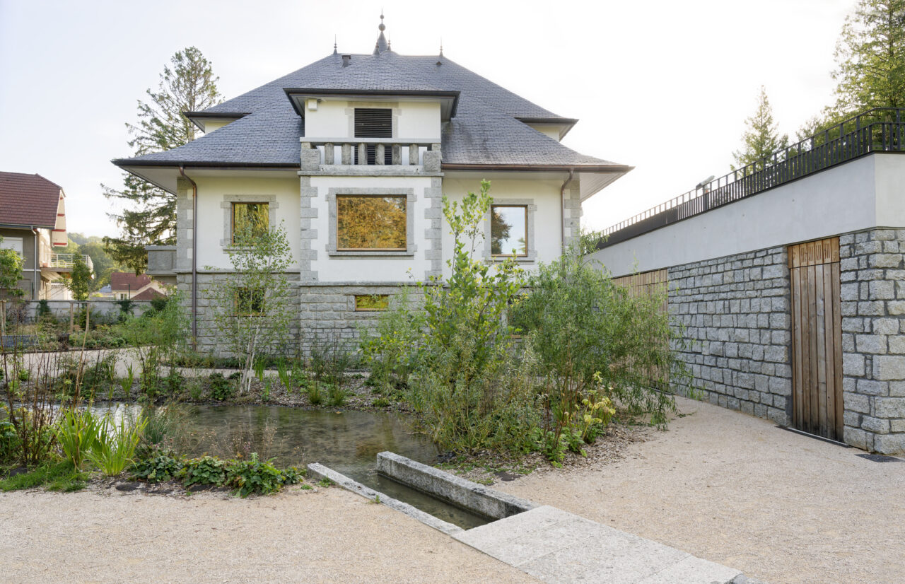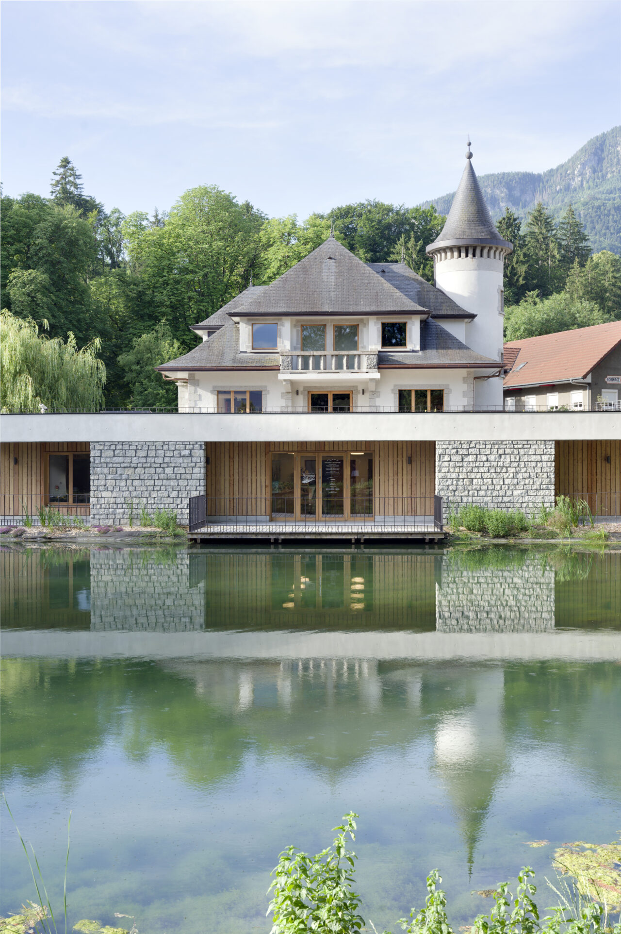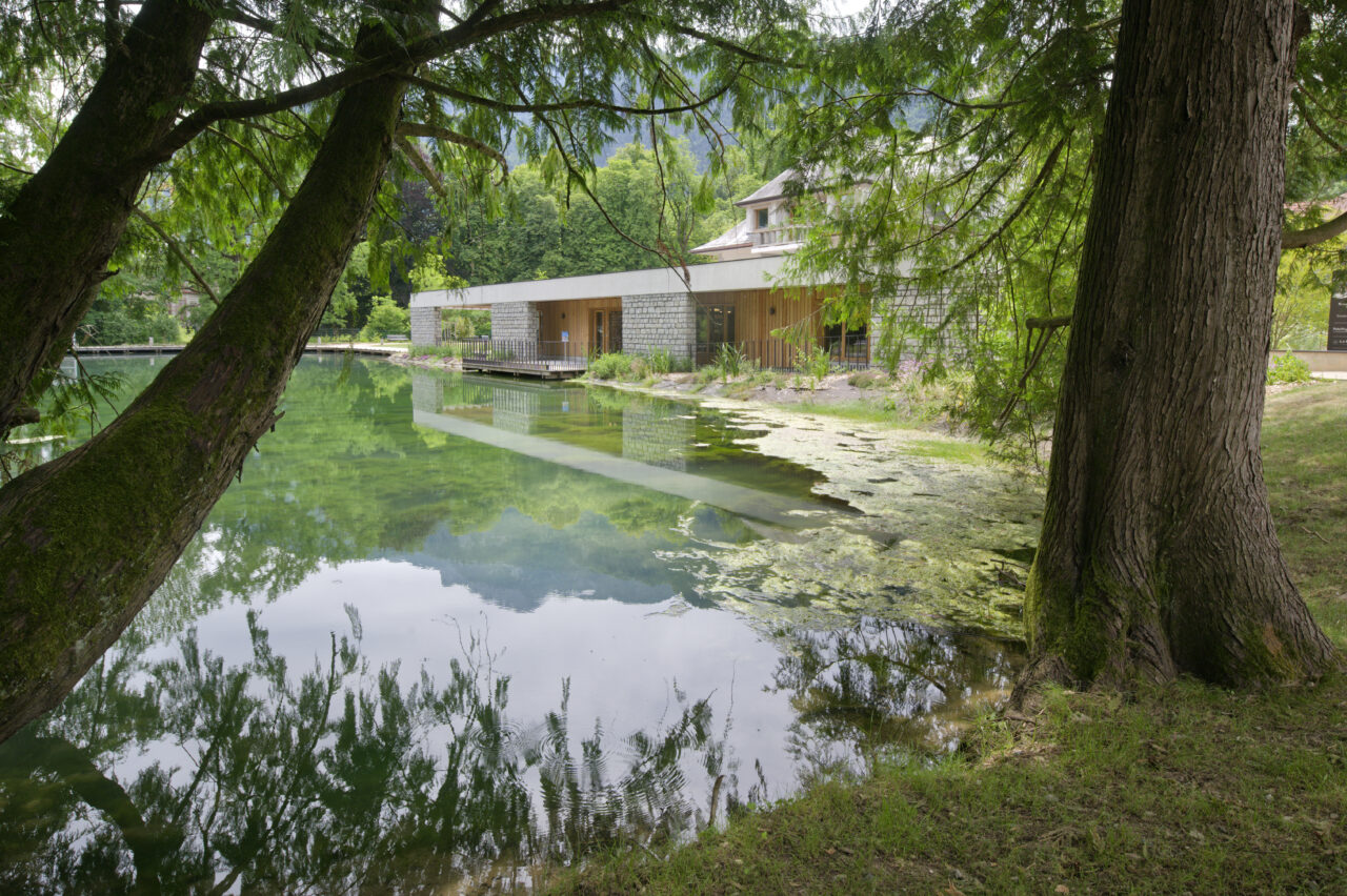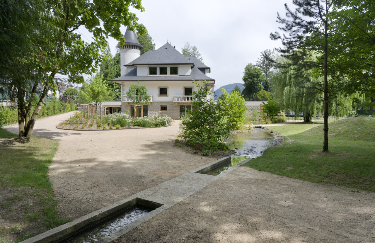 Depuis novembre 2024, la villa Cohendier et son parc ont franchi une nouvelle étape de leur histoire. Les deux entités dialoguent plus que jamais pour offrir aux visiteurs une expérience sensorielle et pédagogique. La villa accueille un centre d’interprétation pour comprendre le territoire, ses enjeux et plus spécifiquement son lien à l’eau. La sensibilisation aux enjeux environnementaux se poursuit dans le parc où l’on peut flâner comme assister au festival Parc’Ô’Sciences depuis l’amphithéâtre. Le cheminement pour en arriver là mérite un regard en arrière. La propriété Cohendier sur laquelle trône la maison-forte est en pied de coteau, bordée par le Borne qui se jette dans l’Arve. Elle est traversée par un bief qui alimente un moulin et une ancienne scierie : à Saint-Pierre-en-Faucigny, l’eau est déterminante géographiquement mais aussi pour les activités humaines. Dans les années 1950, une villa est construite à côté de l’étang présent dans le parc de la propriété Cohendier, en structure de béton mais se référant à l’architecture régionaliste. C’est cette villa et 8 000 m2 du parc alentour que la commune acquiert en 2006. Le parc est tout de suite ouvert au public et plébiscité. Un concours d’architecture est lancé en 2018 pour réhabiliter et étendre la villa, dans le but d’en faire ce lieu témoin de l’histoire locale, environnementale et humaine.