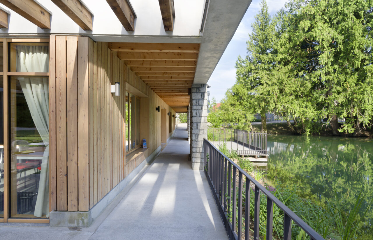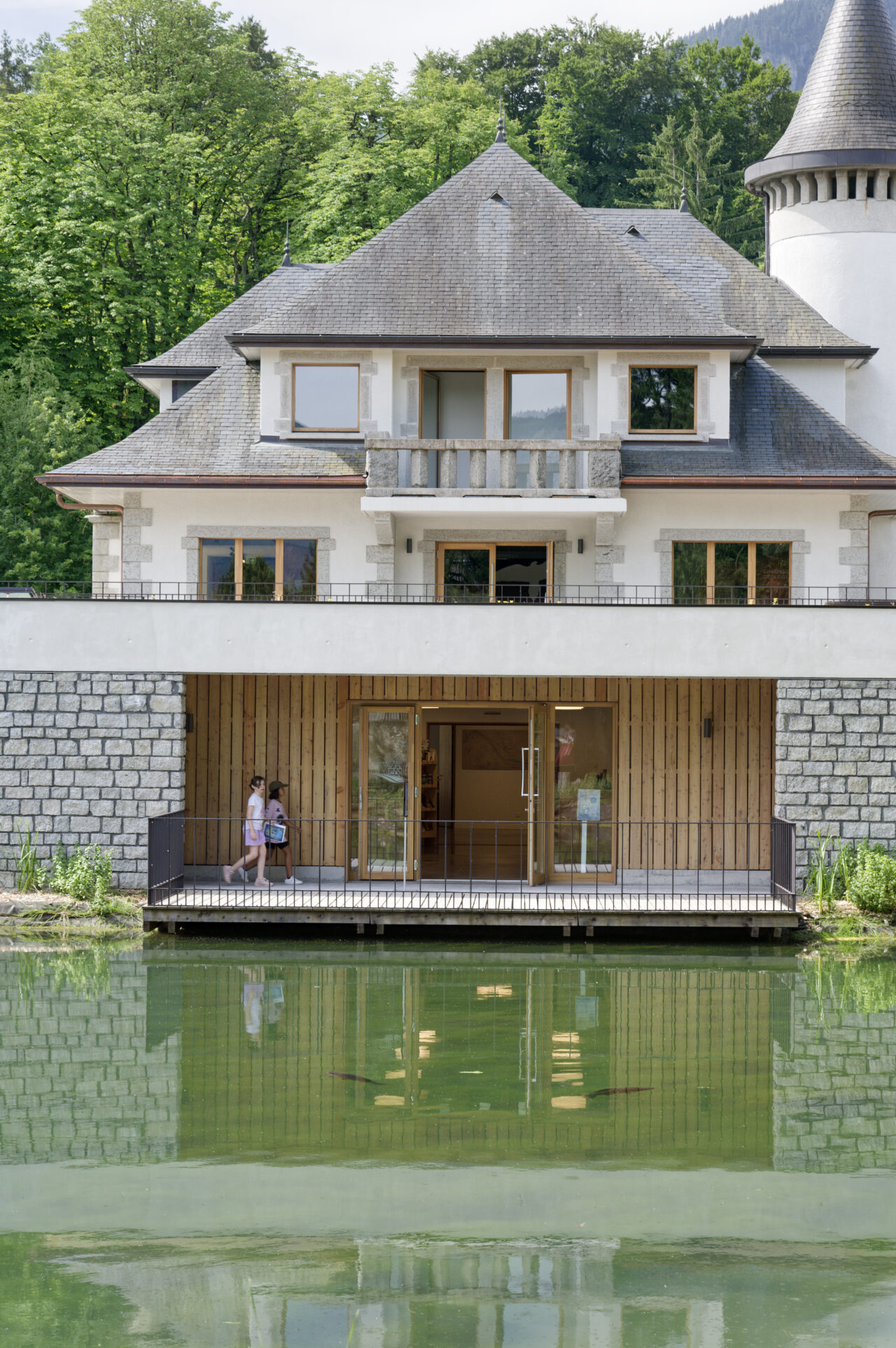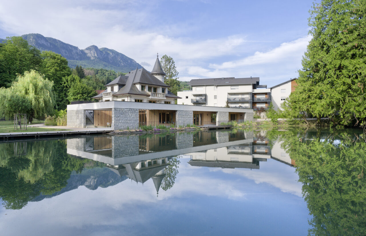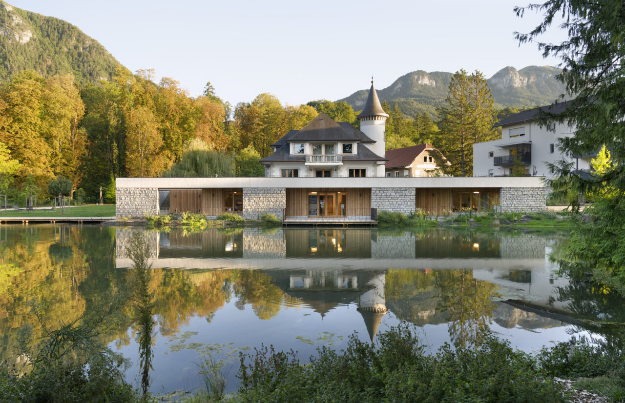 Depuis novembre 2024, la villa Cohendier et son parc ont franchi une nouvelle étape de leur histoire. Les deux entités dialoguent plus que jamais pour offrir aux visiteurs une expérience sensorielle et pédagogique. La villa accueille un centre d’interprétation pour comprendre le territoire, ses enjeux et plus spécifiquement son lien à l’eau. La sensibilisation aux enjeux environnementaux se poursuit dans le parc où l’on peut flâner comme assister au festival Parc’Ô’Sciences depuis l’amphithéâtre. Le cheminement pour en arriver là mérite un regard en arrière. La propriété Cohendier sur laquelle trône la maison-forte est en pied de coteau, bordée par le Borne qui se jette dans l’Arve. Elle est traversée par un bief qui alimente un moulin et une ancienne scierie : à Saint-Pierre-en-Faucigny, l’eau est déterminante géographiquement mais aussi pour les activités humaines. Dans les années 1950, une villa est construite à côté de l’étang présent dans le parc de la propriété Cohendier, en structure de béton mais se référant à l’architecture régionaliste. C’est cette villa et 8 000 m2 du parc alentour que la commune acquiert en 2006. Le parc est tout de suite ouvert au public et plébiscité. Un concours d’architecture est lancé en 2018 pour réhabiliter et étendre la villa, dans le but d’en faire ce lieu témoin de l’histoire locale, environnementale et humaine.