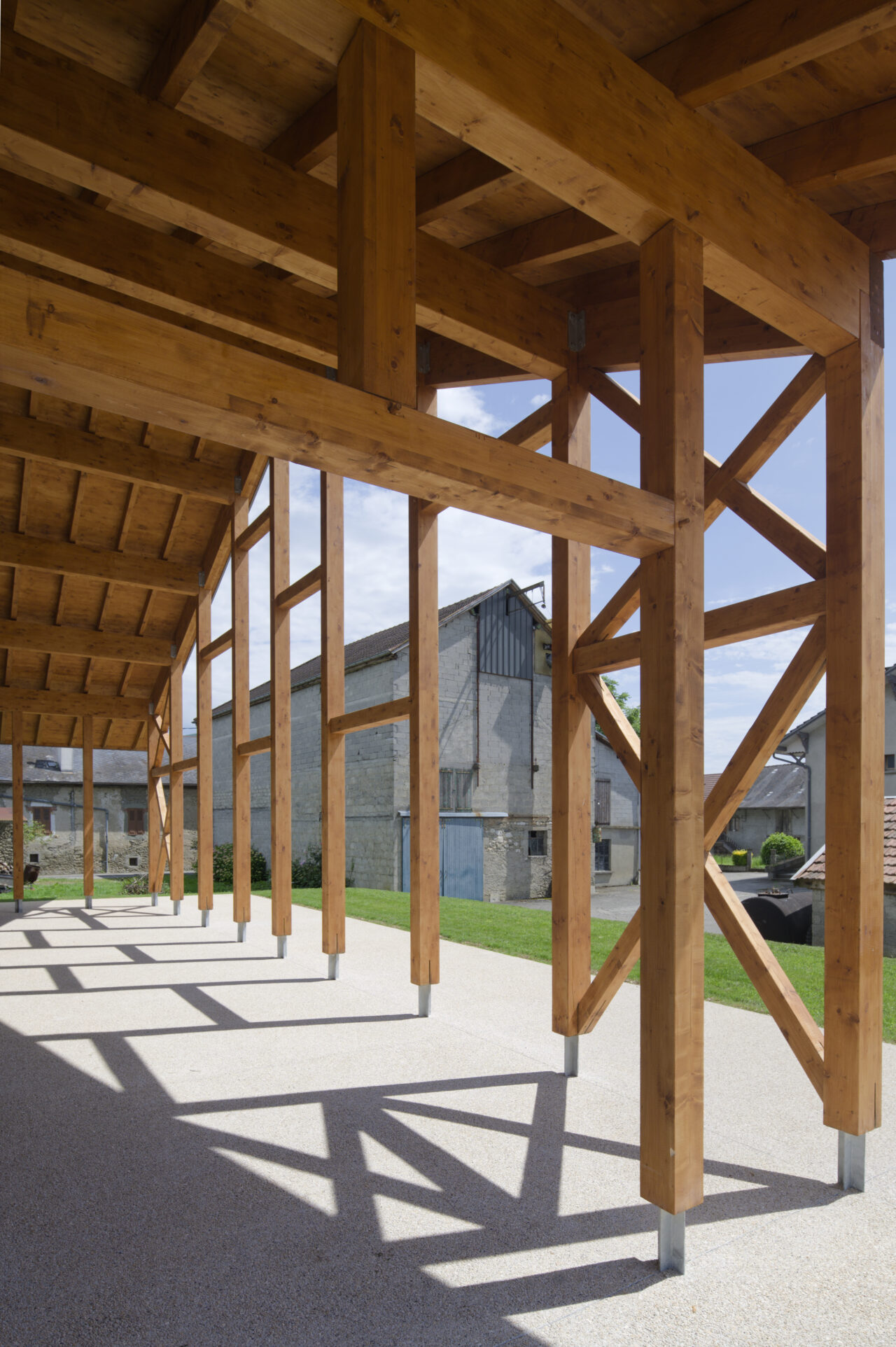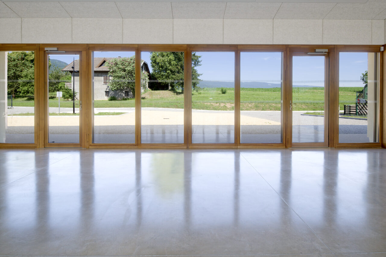 Les 417 habitants de la commune rurale de Bassy méritaient un lieu où puissent se tenir des festivités, mais aussi un bâtiment digne de ce nom pour les services techniques, des locaux pour leurs associations et une salle de motricité pour l’école. De ce vaste programme – attendu depuis une trentaine d’années – a émergé un unique bâtiment conçu par l’agence adp de l’architecte Denis Perret, pensé comme une « intervention ordinaire » où tout se passe ou presque en rez-de-chaussée. En effet, les architectes insistent sur leur volonté de s’effacer devant l’école Jules Ferry voisine, en imaginant un bâtiment longitudinal et d’une hauteur limitée. Loin de poser une barre dans le paysage, la maîtrise d’œuvre a joué sur la transparence, rendant plus aérien le bâtiment à la toiture à deux pans. Malgré la diversité de ses fonctions, ce dernier reste unifié tout en gardant une lisibilité claire : naturellement, l’accueil du public est concentré du côté du village et tourné vers l’école, au sud. Au nord du bâtiment en bordure de champ se trouve le local technique communal. La partie centrale accueille les locaux associatifs dont ceux des chasseurs, chacun avec des besoins spécifiques. Ici, aucun geste architectural pompeux ou inapproprié : le bâtiment est un véritable outil à destination du village, où tous les espaces donnent vers un extérieur qui endosse le nouveau rôle de centralité. Que les abords du bâtiment soient parés d’un chapiteau lors des festivités ou non, les lieux sont fréquentés par les joueurs de l’Agorespace intégré le long du bâtiment, comme par ceux de la pétanque.