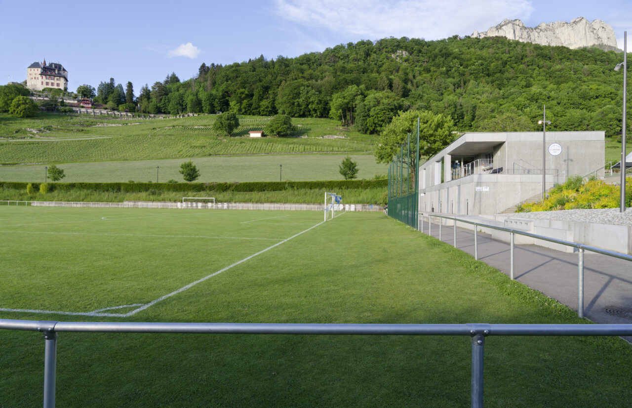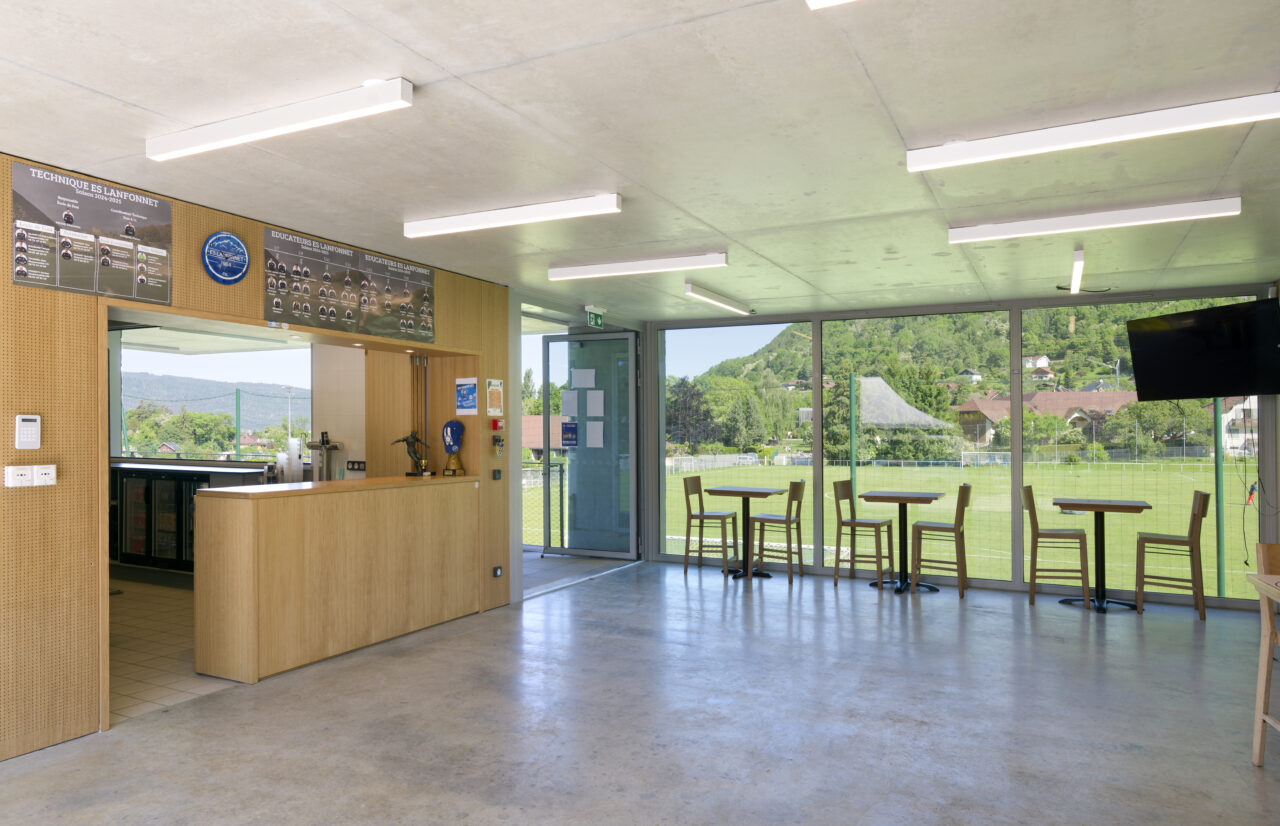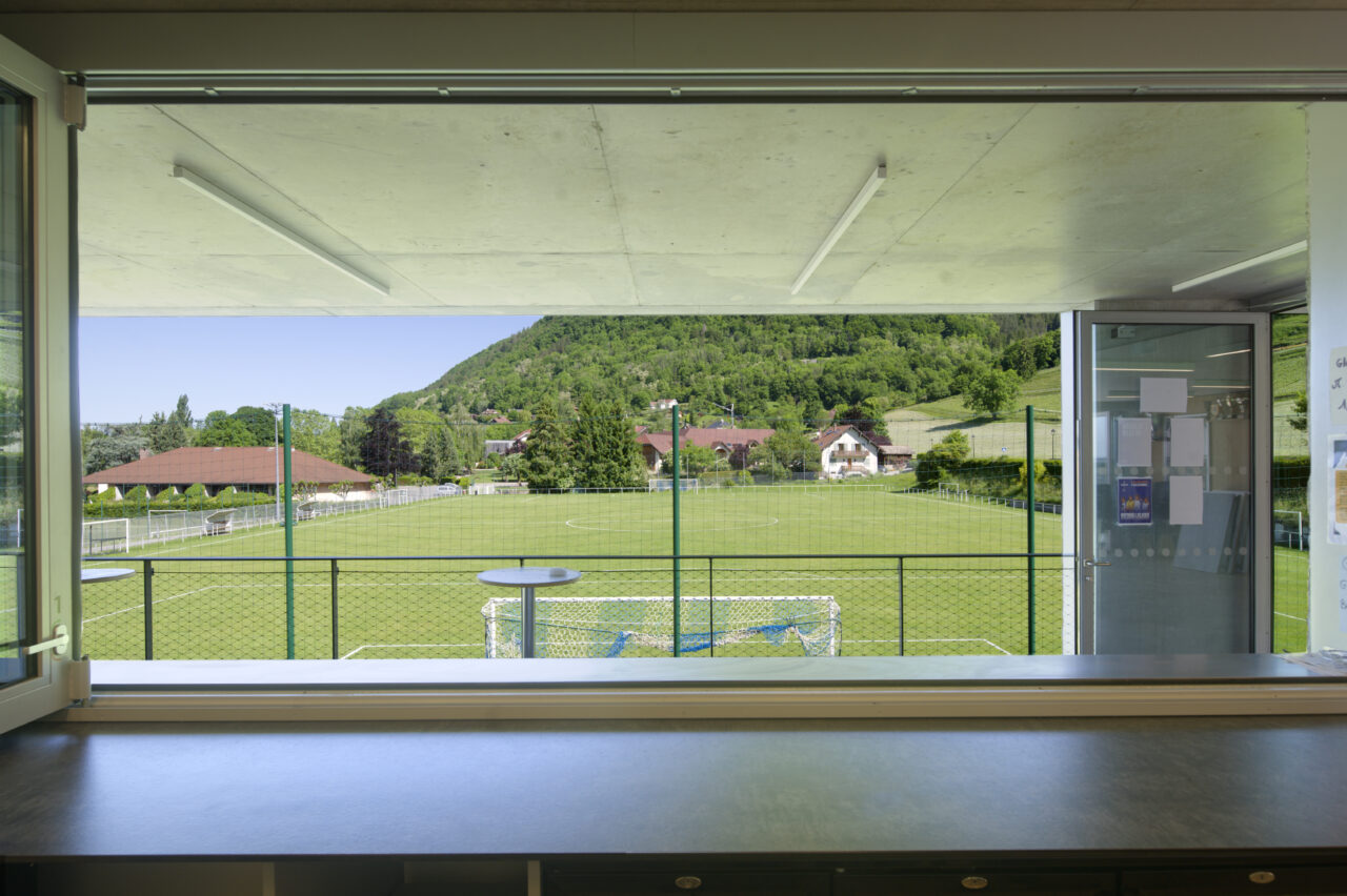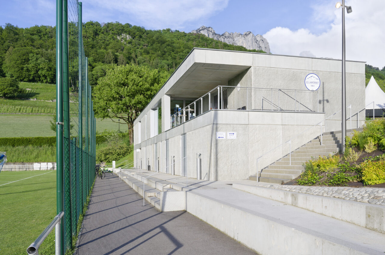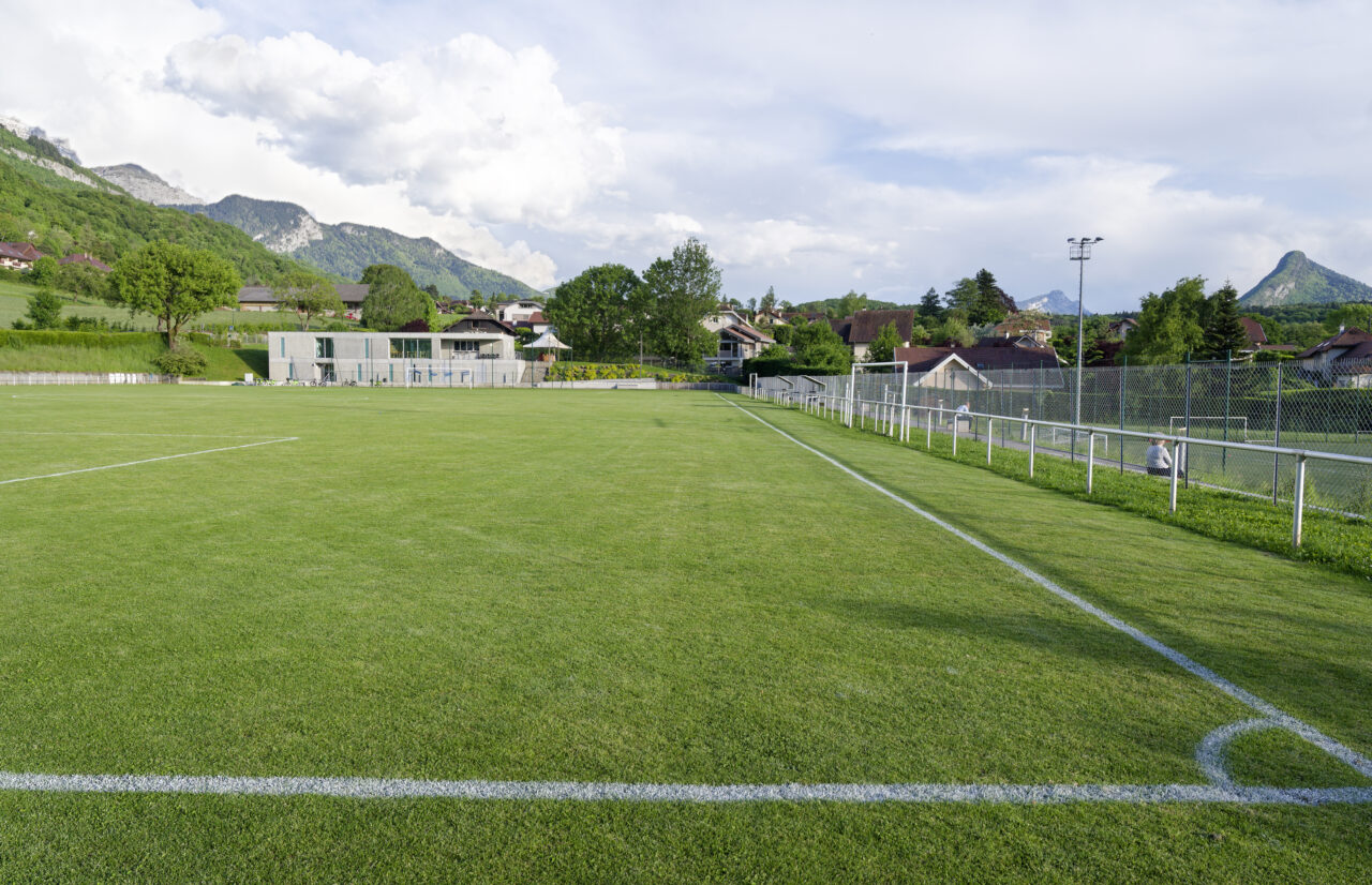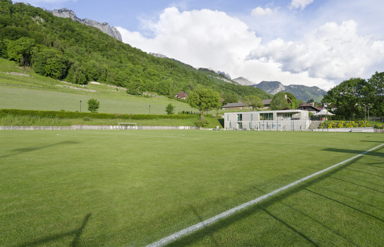 Le stade Jean Dutour de Menthon-Saint-Bernard bénéficie d’une situation exceptionnelle. Les deux plateformes aplanies pour les terrains – l’un en gazon et l’autre synthétique – sont au pied d’un coteau viticole surplombé par le château, en balcon au-dessus du lac d’Annecy. Les dents de Lanfon se dressent à l’ouest, et au nord le mont Baret domine les terrains. À l’origine, le club de foot de Menthon-Saint-Bernard, l’ES Lanfonnet, construit lui-même ses deux vestiaires avec ses joueurs dans les années 1980. Ceux-ci, vétustes, ne répondent plus aux attentes d’un club en pleine croissance d’une part et se féminisant d’autre part. Le SIVOM de la Tournette, en charge des équipements sportifs, lance donc le projet de construction d’un nouveau bâtiment hébergeant huit vestiaires, un club-house et tous les équipements indispensables à un travail de qualité. Celui-ci se place à l’extrémité sud du terrain de gazon qui accueille les matchs, une originalité qui n’est pas sans déplaire au club. L’architecte Patrick Maisonnet, qui a conçu le bâtiment, s’est évertué à lui donner une transparence centrale dès l’entrée qui donne de la perspective sur le terrain. Aujourd’hui, le site et le bâtiment sont riches de situations pour voir les terrains.
