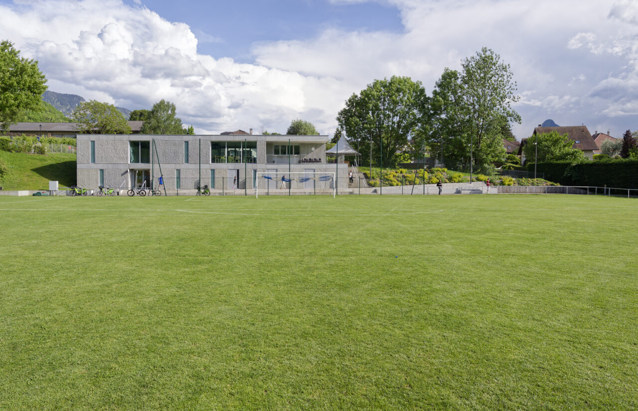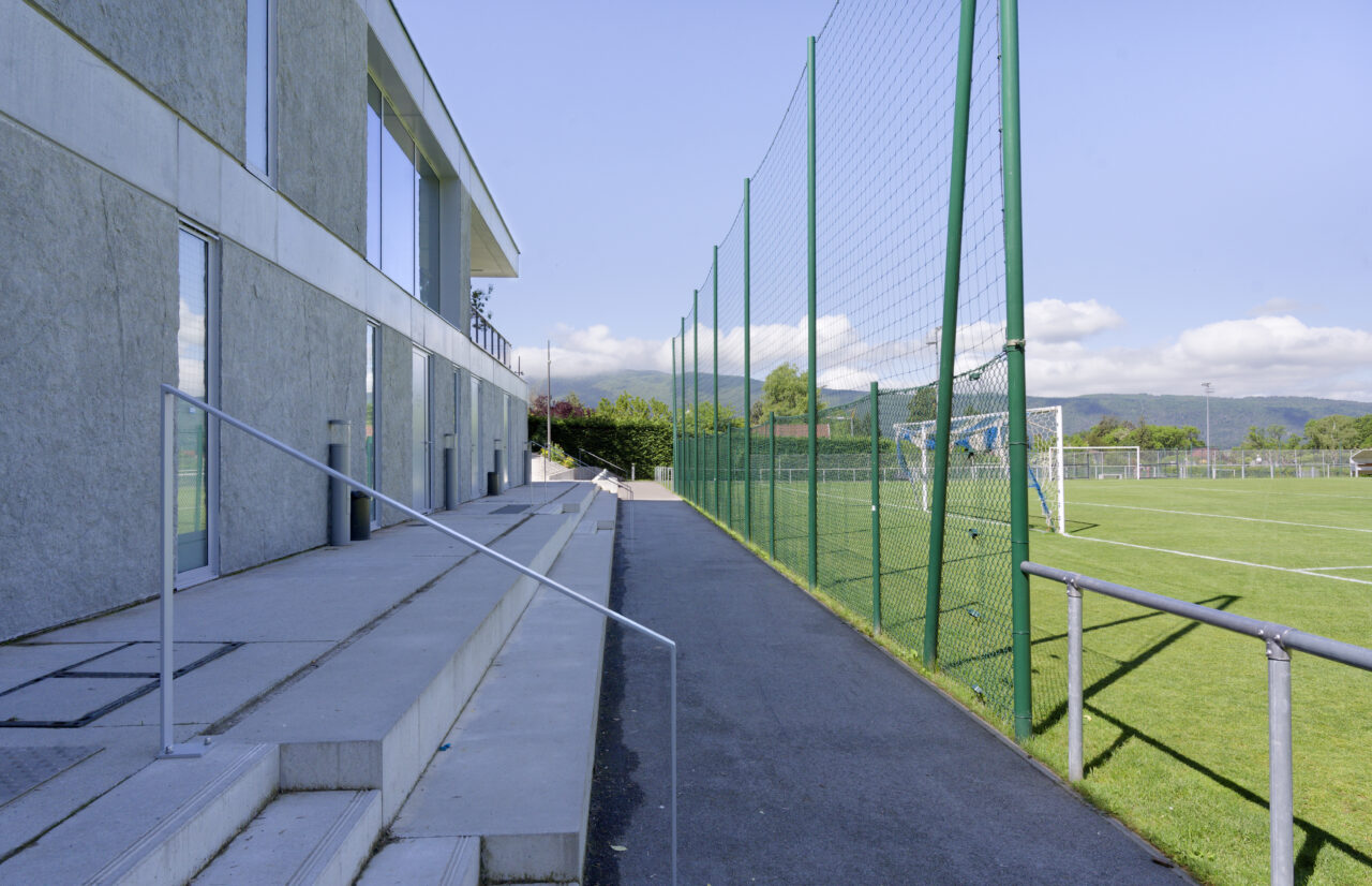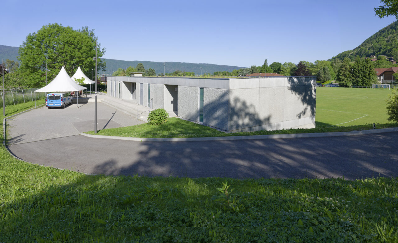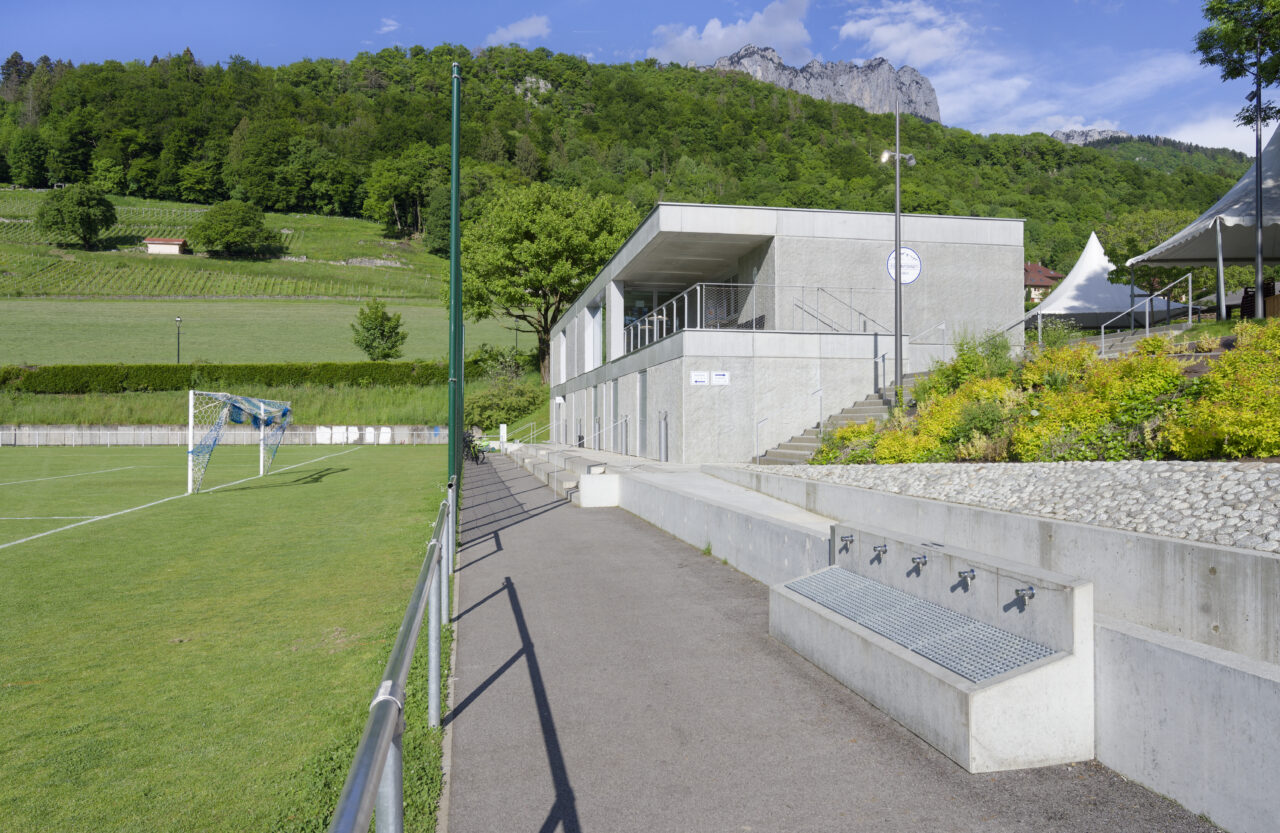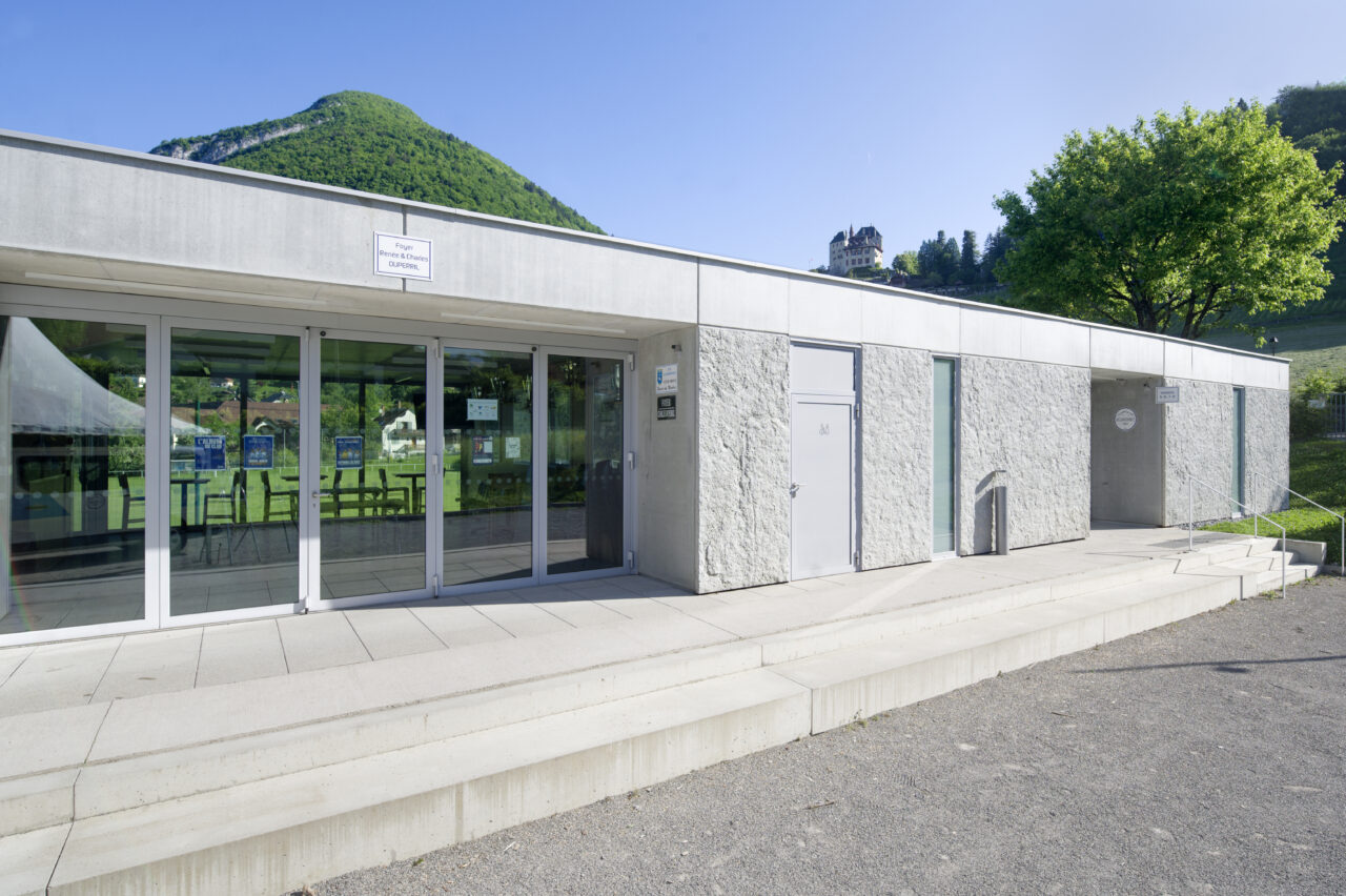 Le stade Jean Dutour de Menthon-Saint-Bernard bénéficie d’une situation exceptionnelle. Les deux plateformes aplanies pour les terrains – l’un en gazon et l’autre synthétique – sont au pied d’un coteau viticole surplombé par le château, en balcon au-dessus du lac d’Annecy. Les dents de Lanfon se dressent à l’ouest, et au nord le mont Baret domine les terrains. À l’origine, le club de foot de Menthon-Saint-Bernard, l’ES Lanfonnet, construit lui-même ses deux vestiaires avec ses joueurs dans les années 1980. Ceux-ci, vétustes, ne répondent plus aux attentes d’un club en pleine croissance d’une part et se féminisant d’autre part. Le SIVOM de la Tournette, en charge des équipements sportifs, lance donc le projet de construction d’un nouveau bâtiment hébergeant huit vestiaires, un club-house et tous les équipements indispensables à un travail de qualité. Celui-ci se place à l’extrémité sud du terrain de gazon qui accueille les matchs, une originalité qui n’est pas sans déplaire au club. L’architecte Patrick Maisonnet, qui a conçu le bâtiment, s’est évertué à lui donner une transparence centrale dès l’entrée qui donne de la perspective sur le terrain. Aujourd’hui, le site et le bâtiment sont riches de situations pour voir les terrains.