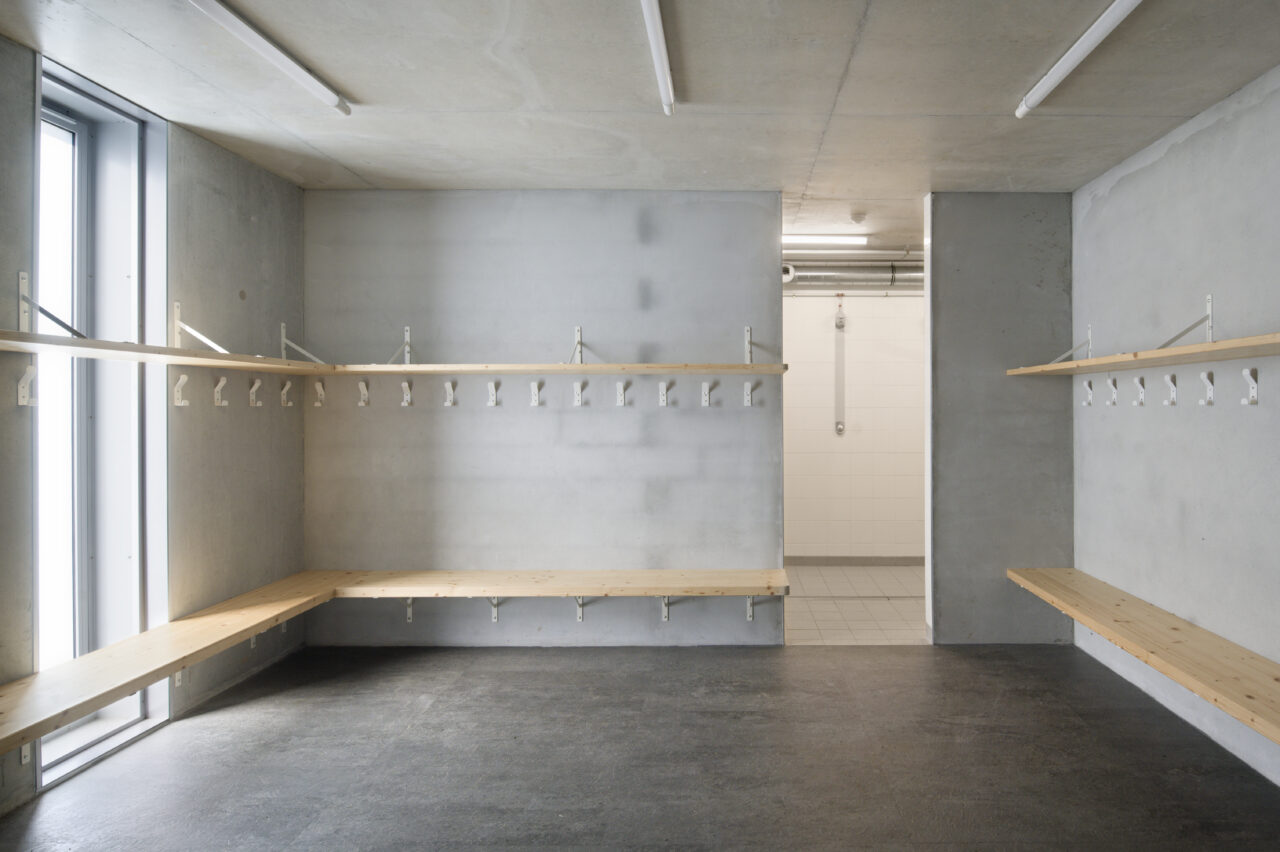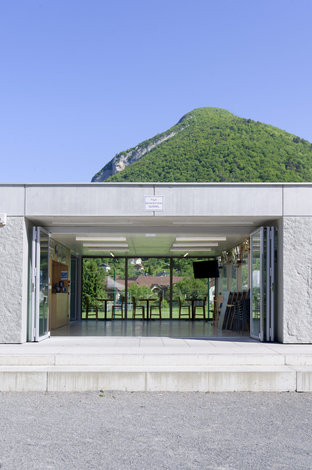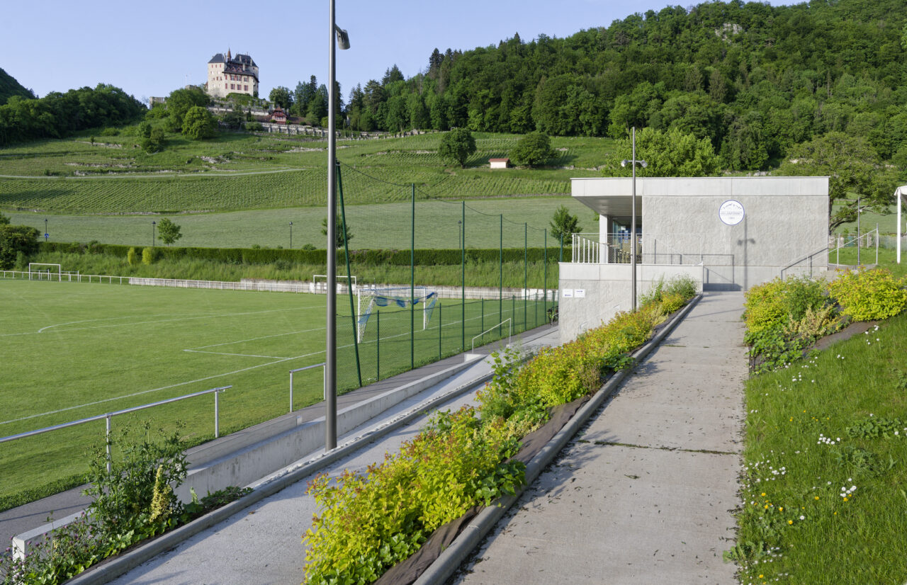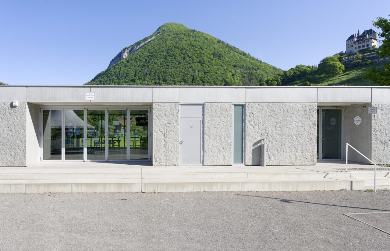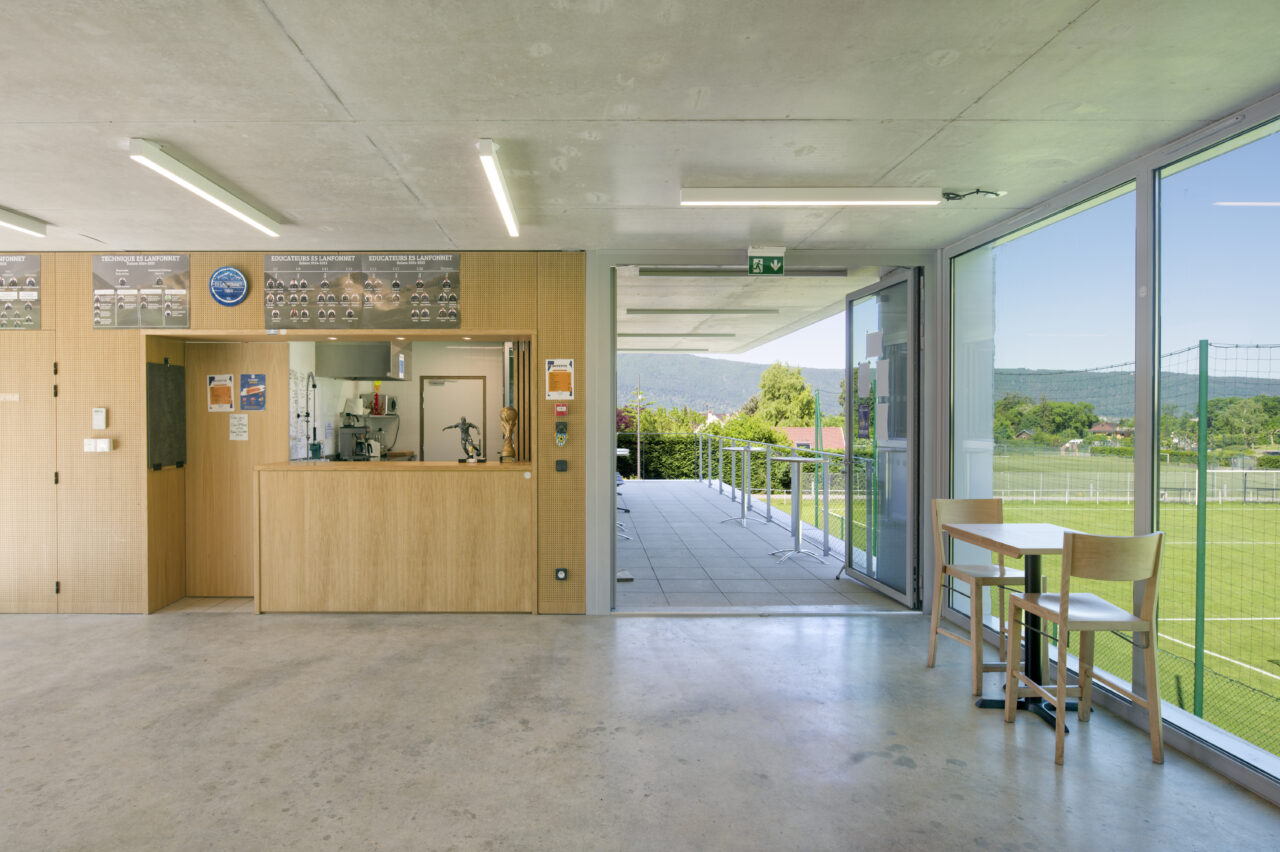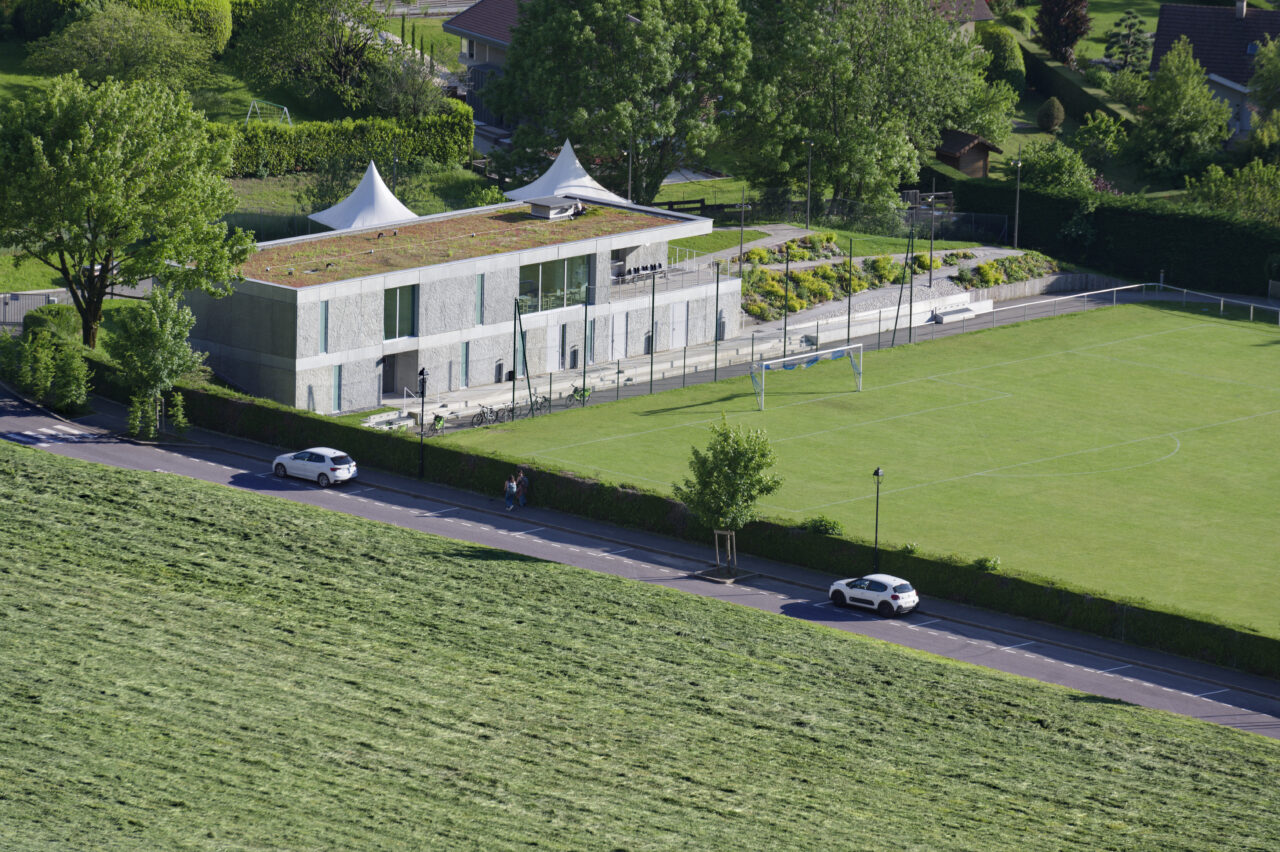 Le stade Jean Dutour de Menthon-Saint-Bernard bénéficie d’une situation exceptionnelle. Les deux plateformes aplanies pour les terrains – l’un en gazon et l’autre synthétique – sont au pied d’un coteau viticole surplombé par le château, en balcon au-dessus du lac d’Annecy. Les dents de Lanfon se dressent à l’ouest, et au nord le mont Baret domine les terrains. À l’origine, le club de foot de Menthon-Saint-Bernard, l’ES Lanfonnet, construit lui-même ses deux vestiaires avec ses joueurs dans les années 1980. Ceux-ci, vétustes, ne répondent plus aux attentes d’un club en pleine croissance d’une part et se féminisant d’autre part. Le SIVOM de la Tournette, en charge des équipements sportifs, lance donc le projet de construction d’un nouveau bâtiment hébergeant huit vestiaires, un club-house et tous les équipements indispensables à un travail de qualité. Celui-ci se place à l’extrémité sud du terrain de gazon qui accueille les matchs, une originalité qui n’est pas sans déplaire au club. L’architecte Patrick Maisonnet, qui a conçu le bâtiment, s’est évertué à lui donner une transparence centrale dès l’entrée qui donne de la perspective sur le terrain. Aujourd’hui, le site et le bâtiment sont riches de situations pour voir les terrains.